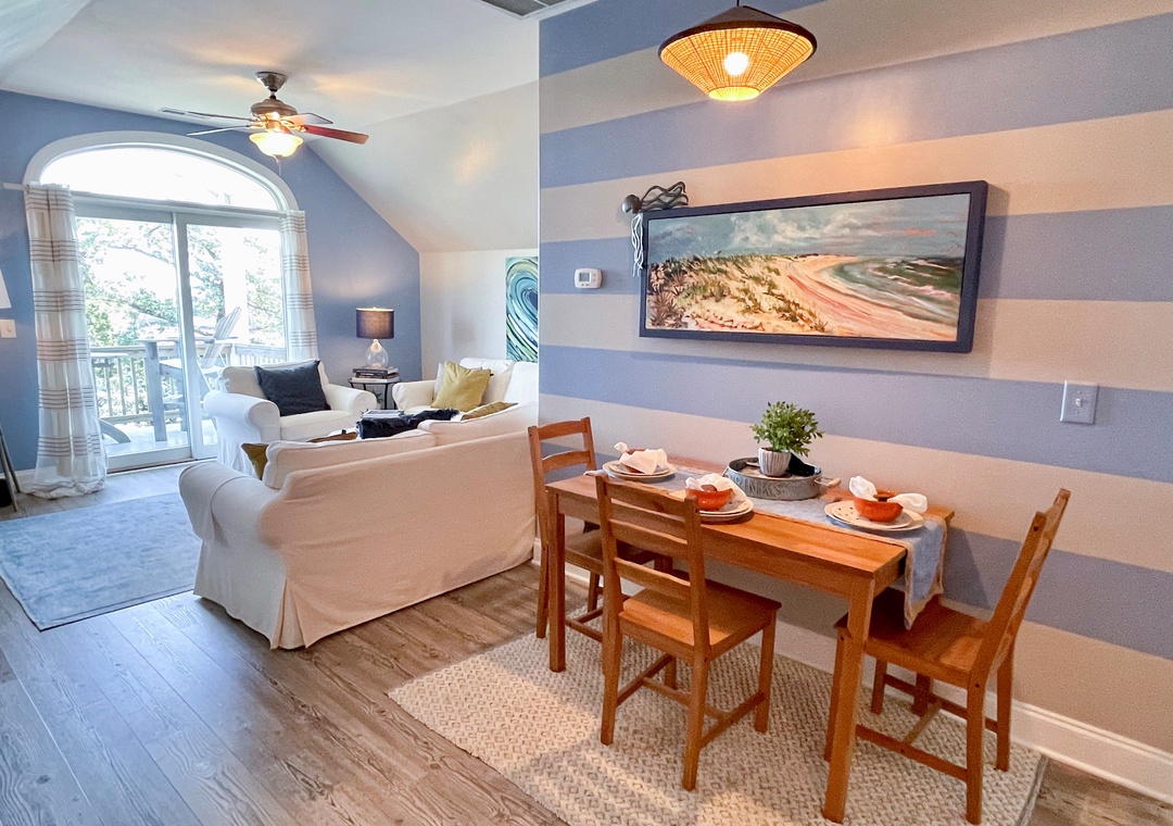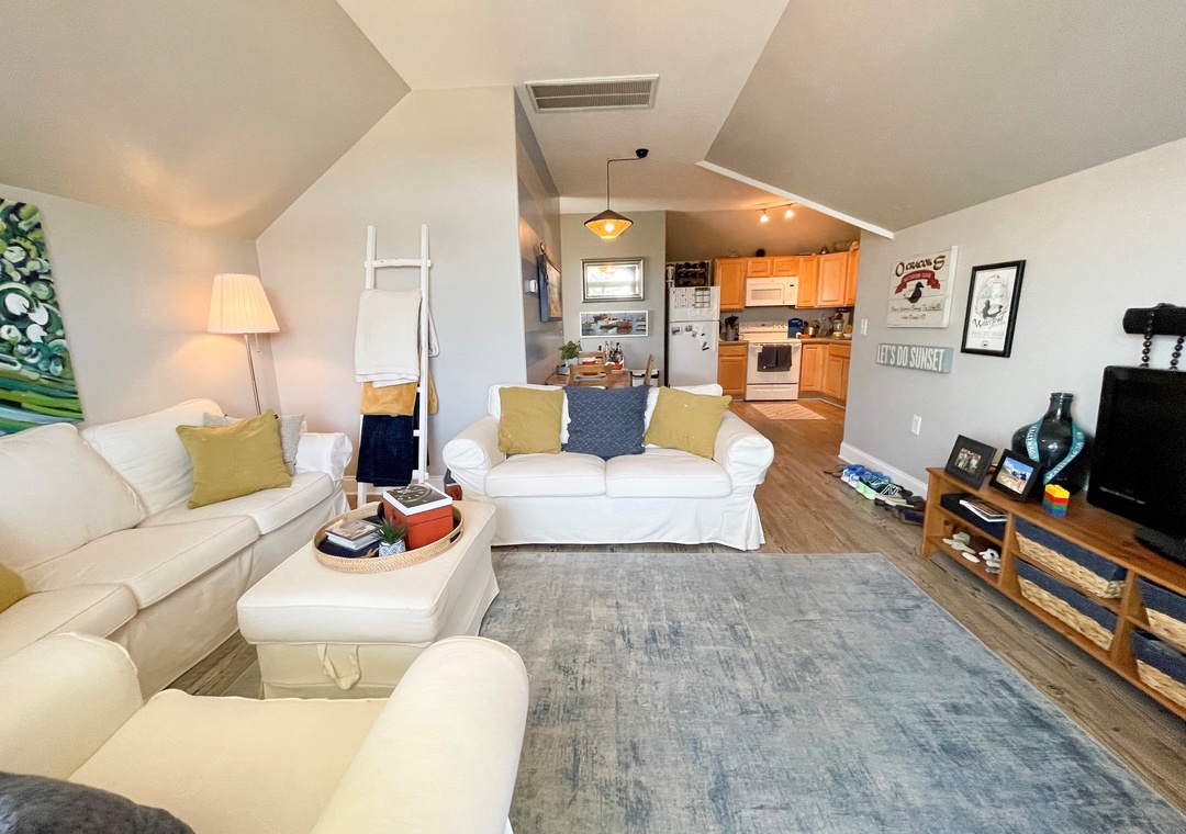 Serenity Now is a top floor/ third level, Penthouse Suite featuring an open and airy kitchen/living/dining space adorned with unique artwork and comfortable furnishings, luxury vinyl flooring, ceiling fans, and recessed lighting. It comes complete with a full-sized washer/dryer and a fully equipped kitchen. The living room seamlessly connects to a covered deck, furnished for your comfort, offering a splendid view of the spacious front yard, perfect for outdoor activities and picnics. The Boyette complex offers a large swimming pool with a well-appointed deck furnished with lounge chairs, ideal for sunbathing, relaxation, and socializing.