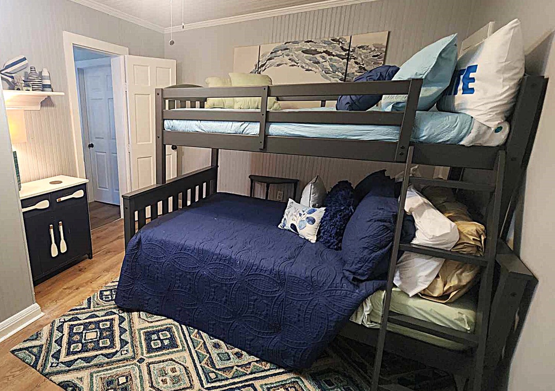 4 bedrooms, 2 and a half baths: 2 with King, 1 with Queen, 1 with Pyramid Bunk (Double on the bottom, Twin on top).