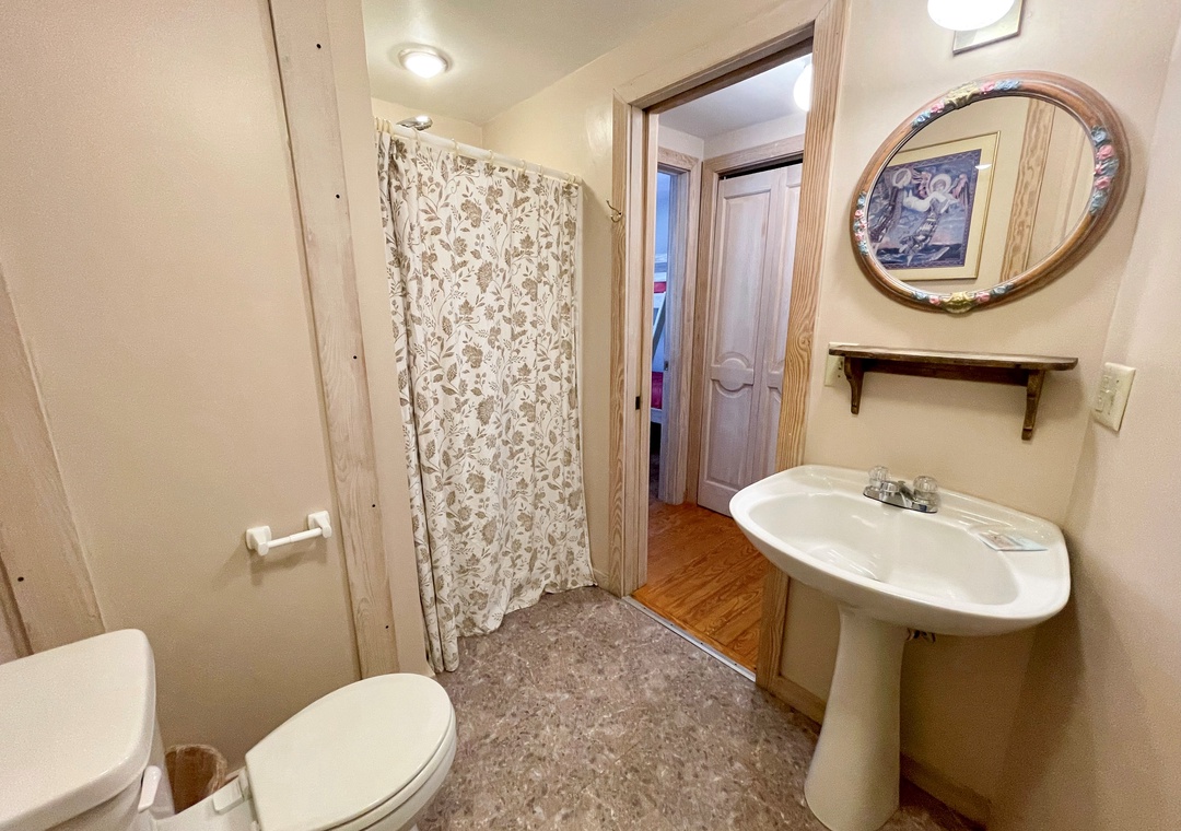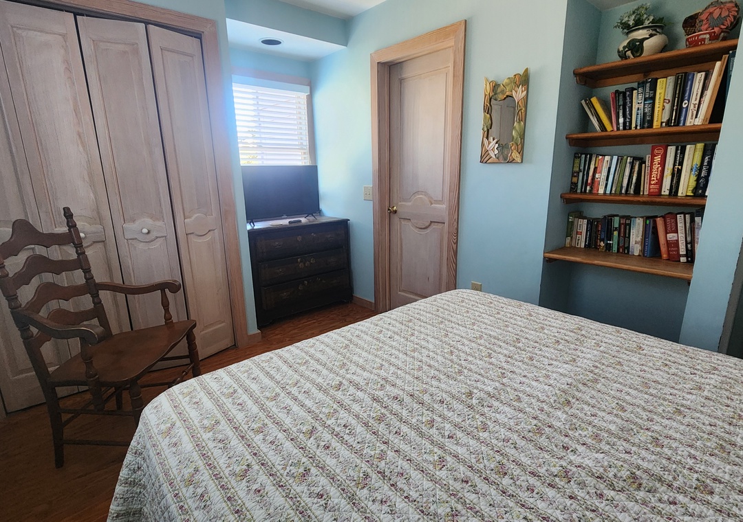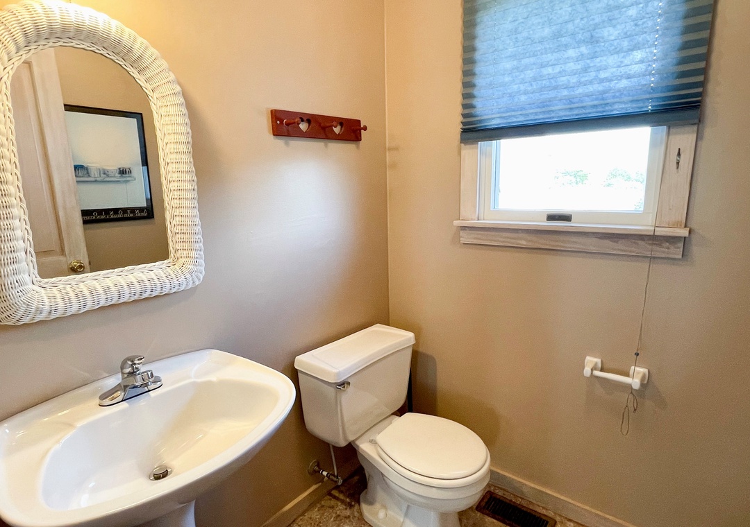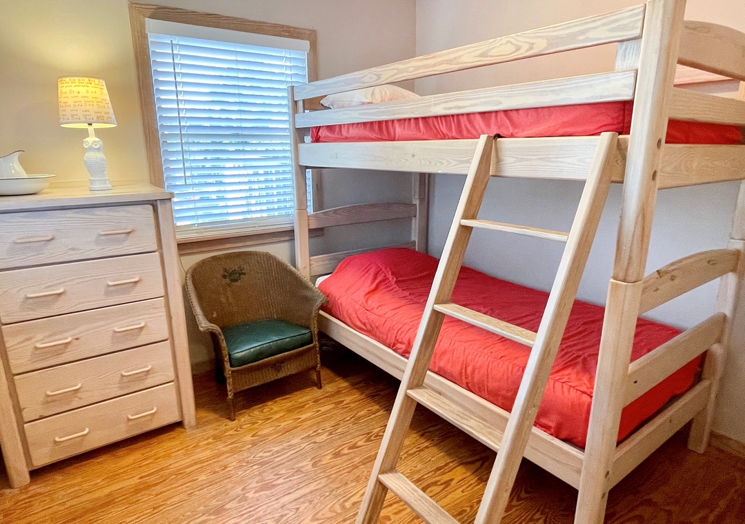 First Floor: Bedroom with Queen bed and TV. Bedroom with Queen and TV, and Semi-Private Bath with soaking tub/shower. Bedroom with Bunk Bed. Bath with shower stall. Laundry room.