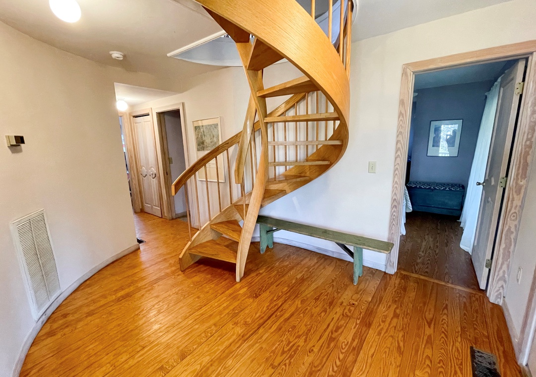 Second Floor: Spiral staircase to the second floor. Open floor plan with dining, kitchen, and living area with TV/DVD/VCR. Bedroom with Queen bed and TV. Half bath.