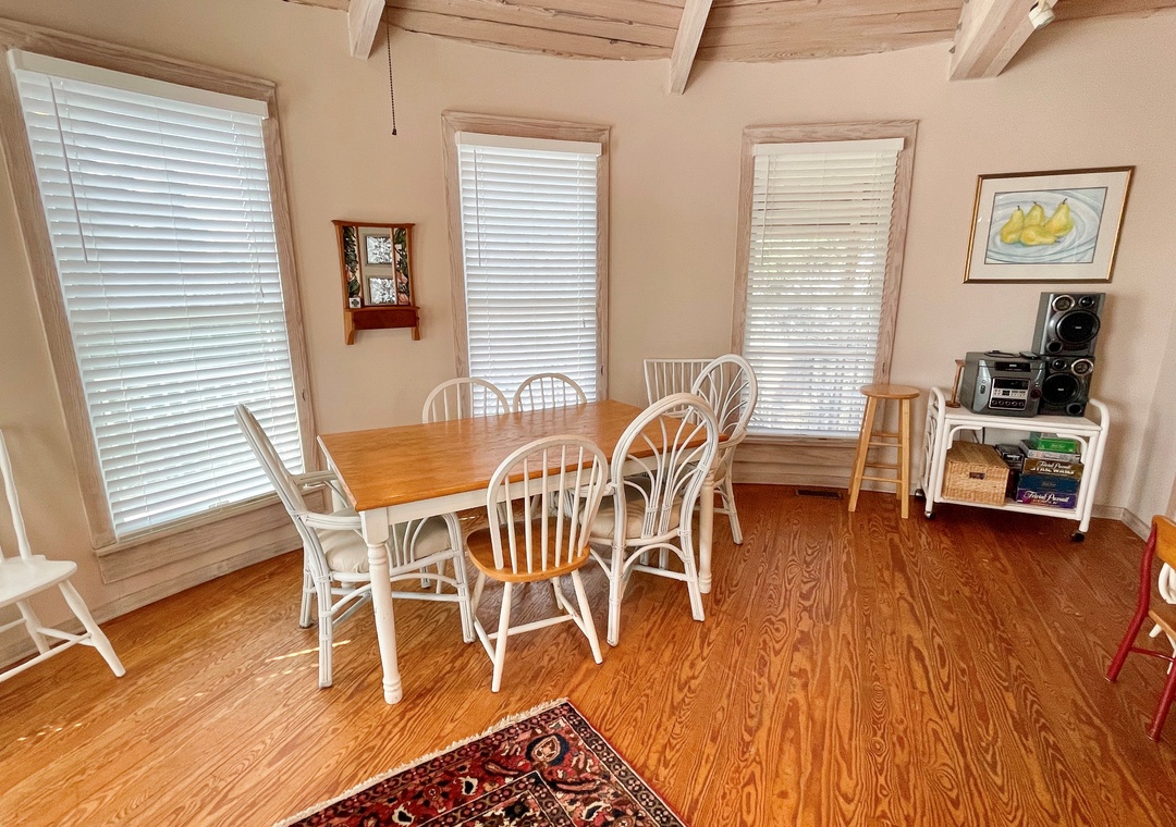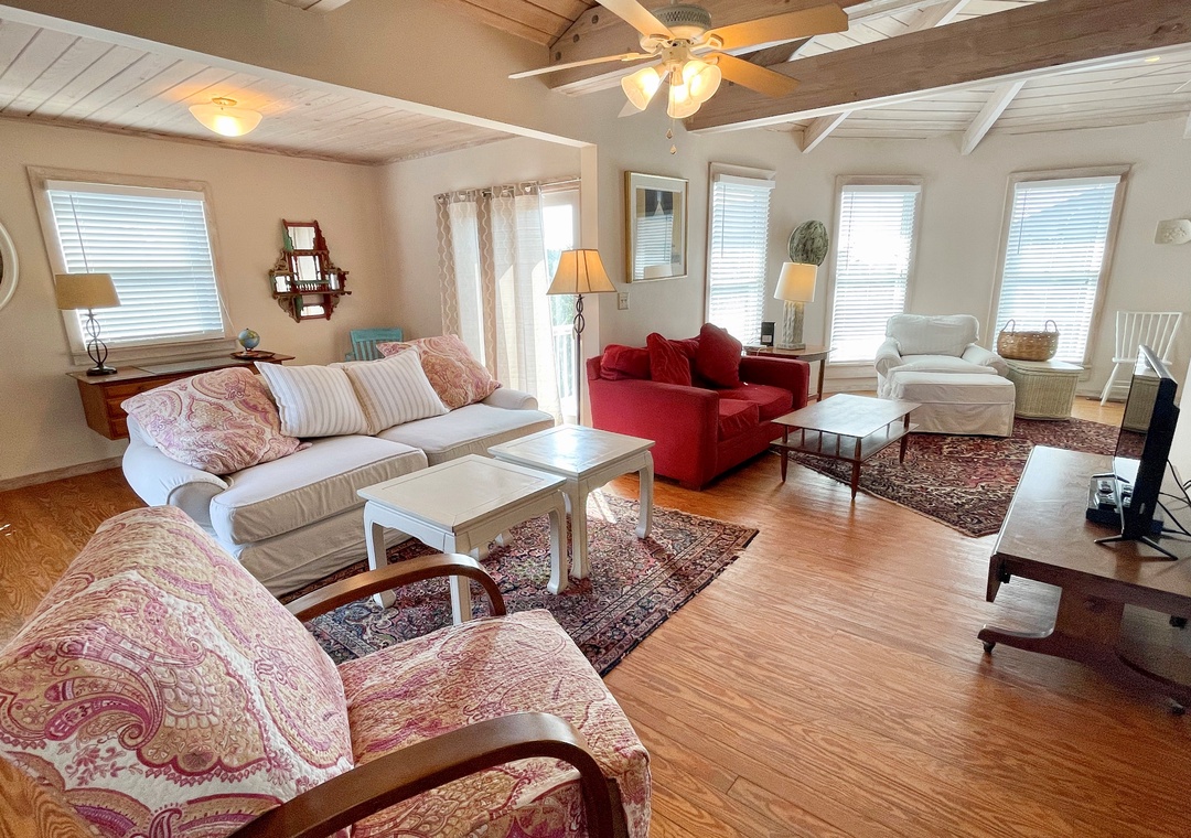 Amenities include central air conditioning/heat, ceiling fans, complimentary wireless internet access, and four cable TVs. Spiral staircase to the second floor. Washer and dryer.