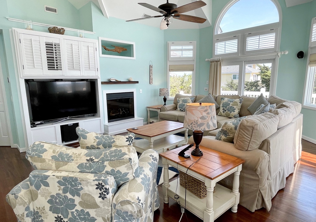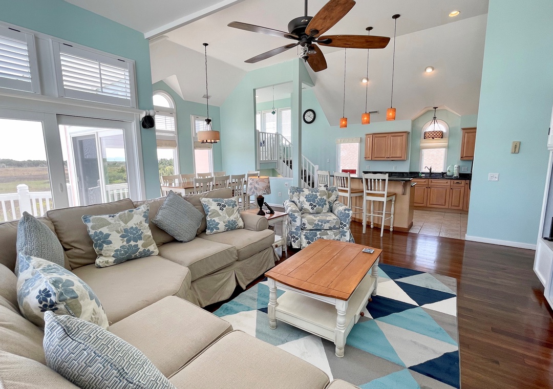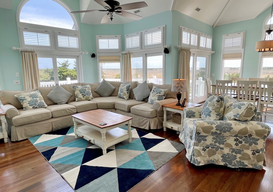 This home truly features something for everyone in your family! Relax in the oversized six-person **hot tub or lounge beside your private pool. Feel in tune with nature as you gaze out over the blowing marsh grasses, enjoy a movie or sports event on the 52" Plasma Flat Screen TV with surround sound, play basketball in the yard, or gather together for a family meal.