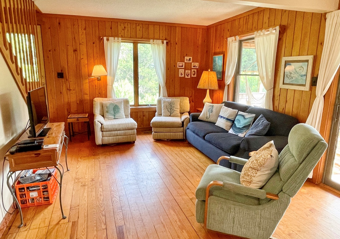 First Floor: Open dining and living area with TV/DVD. Kitchen. Bedroom with Queen bed. Entry sunroom. Full bath with tub/shower. Laundry area.