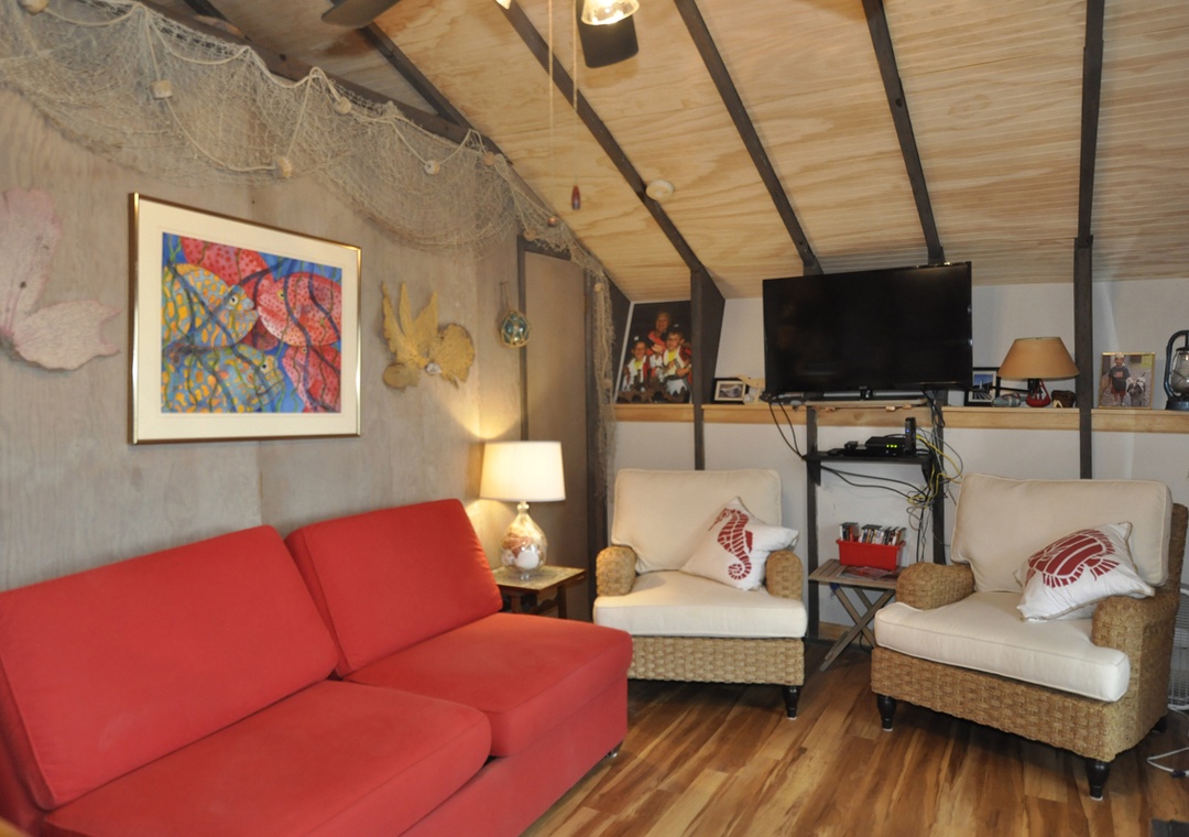 Amenities include central air conditioning/heat, ceiling fans, complimentary wireless internet access, and two cable TVs (including a 42-inch TVs in the living area and a TV in the bedroom). The kitchen offers a microwave (no dishwasher).