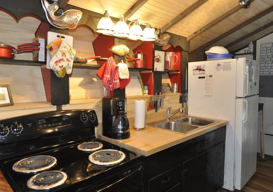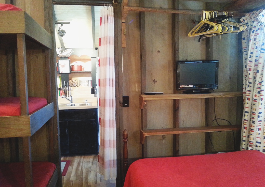 Single story home: Open dining and living area with TV. Kitchen. Bedroom with a Double bed and two sets of Bunk Beds. Queen Sleeper Sofa in the living room. Bath with shower stall is accessed via the Bedroom.