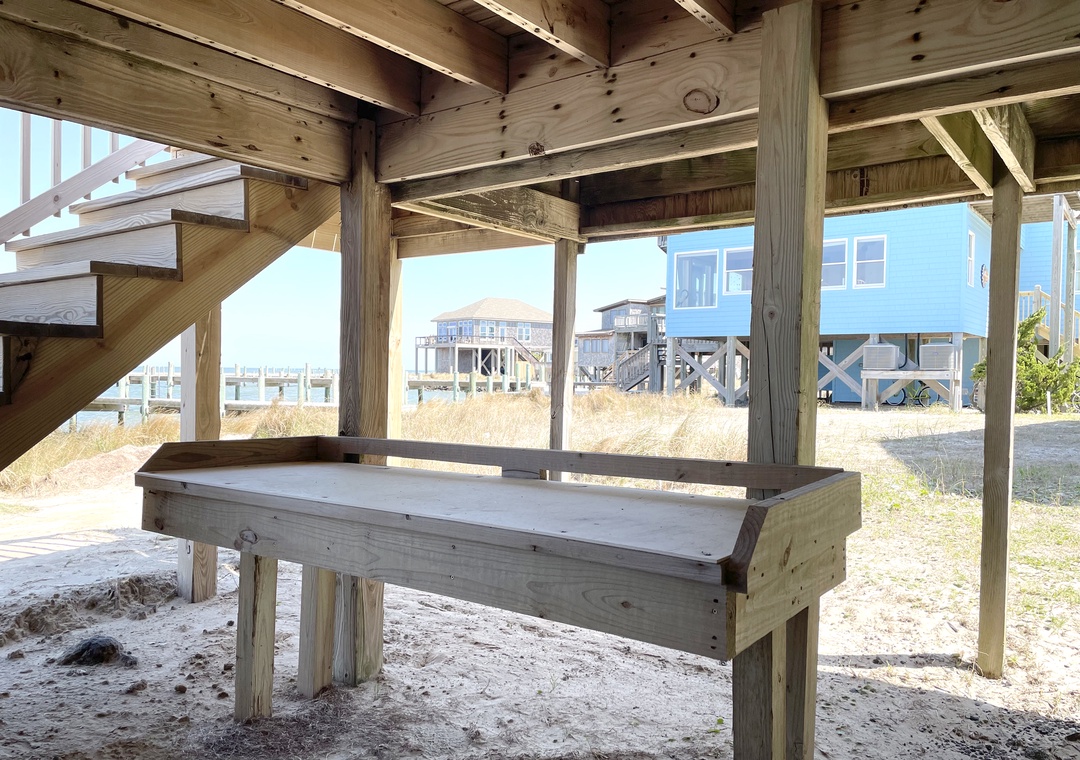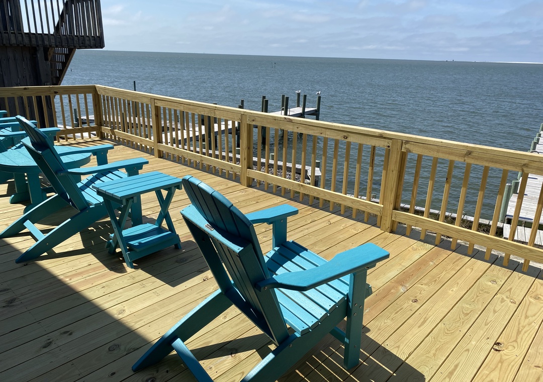 The exterior offers a private boat dock, a large deck, screened porch, charcoal grill, outdoor shower, and fish cleaning bench. 2 single kayaks and 1 double kayak. Life jackets are not provided. If you wish to rent them, please get in touch with Ride The Wind Surf Shop. They will be happy to assist.