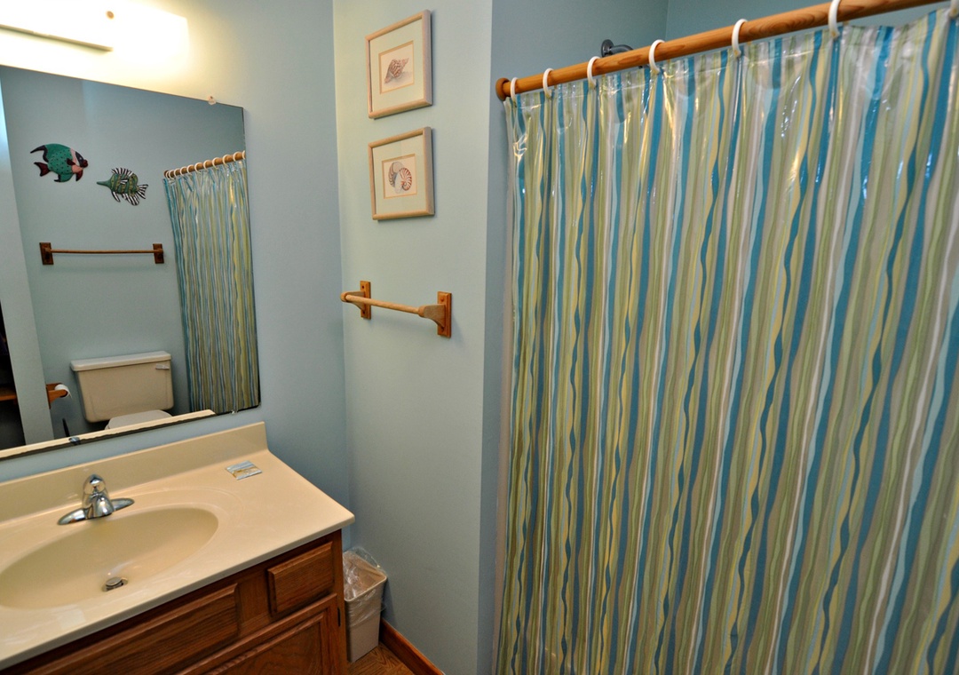 3 Bedrooms, 2 Baths: 2 bedrooms with a Queen each, 1 with two Twins. Hallway bath with a tub/shower and Primary Bath with shower.