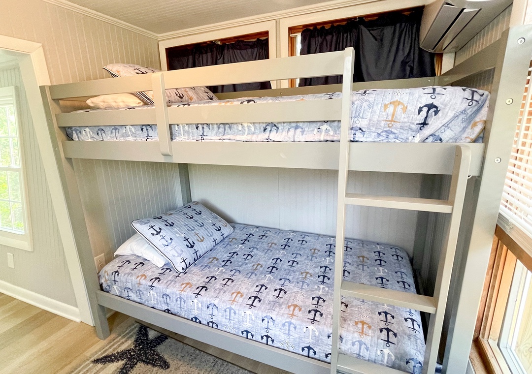 Main House: 1 bedroom with Queen and 1 bedroom with Bunk Bed. A futon in the living area offers flexible sleeping options. 1 full bath with shower and 1 half bath. The Barn : 3 Twin beds and a half bath. The maximum occupancy is seven people, including children.