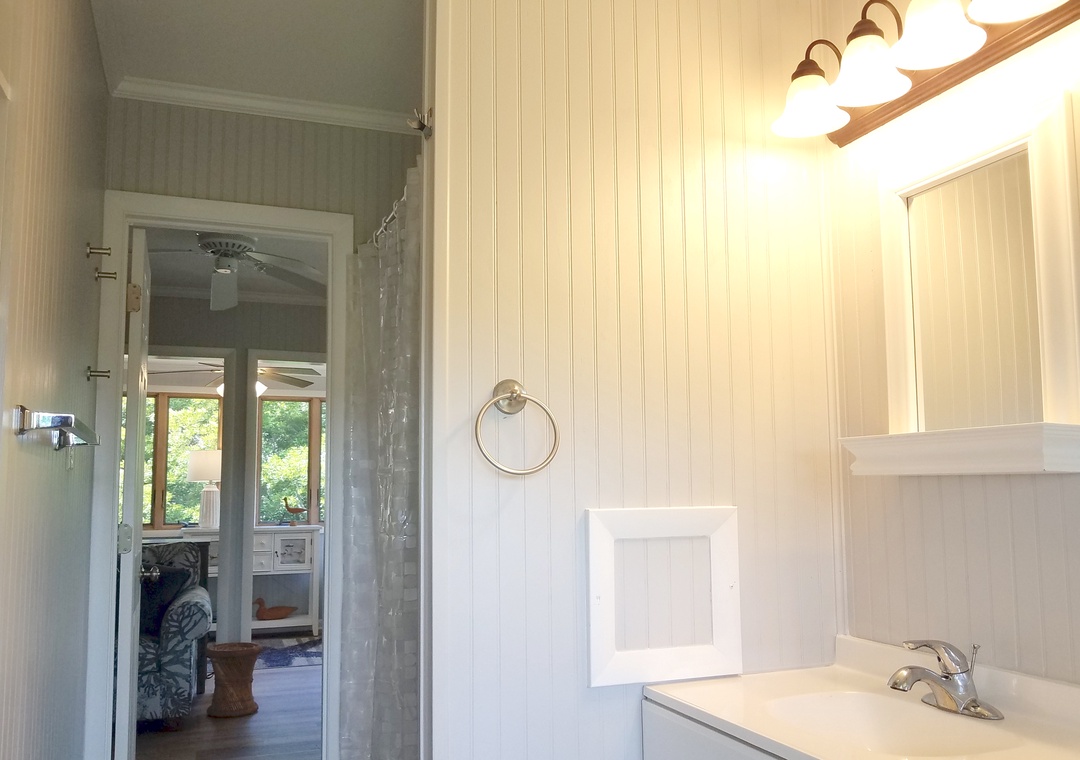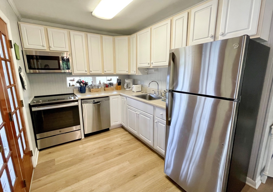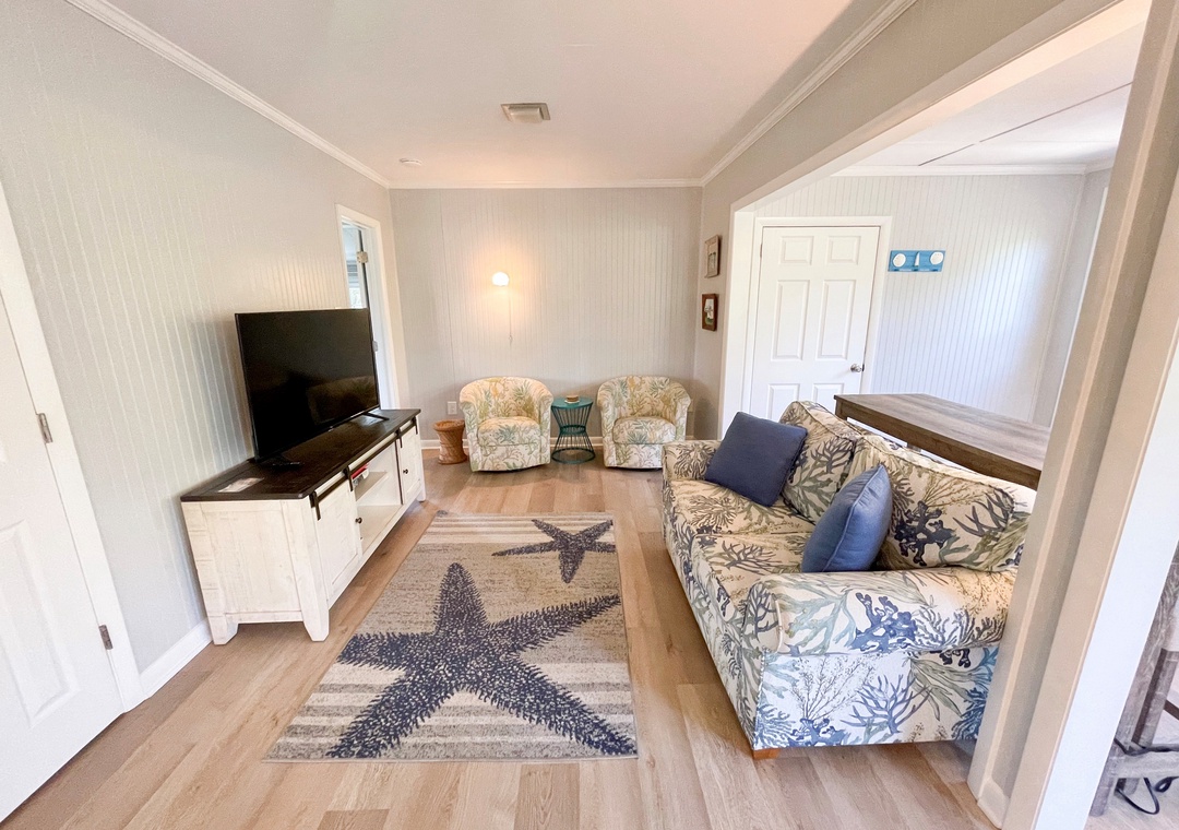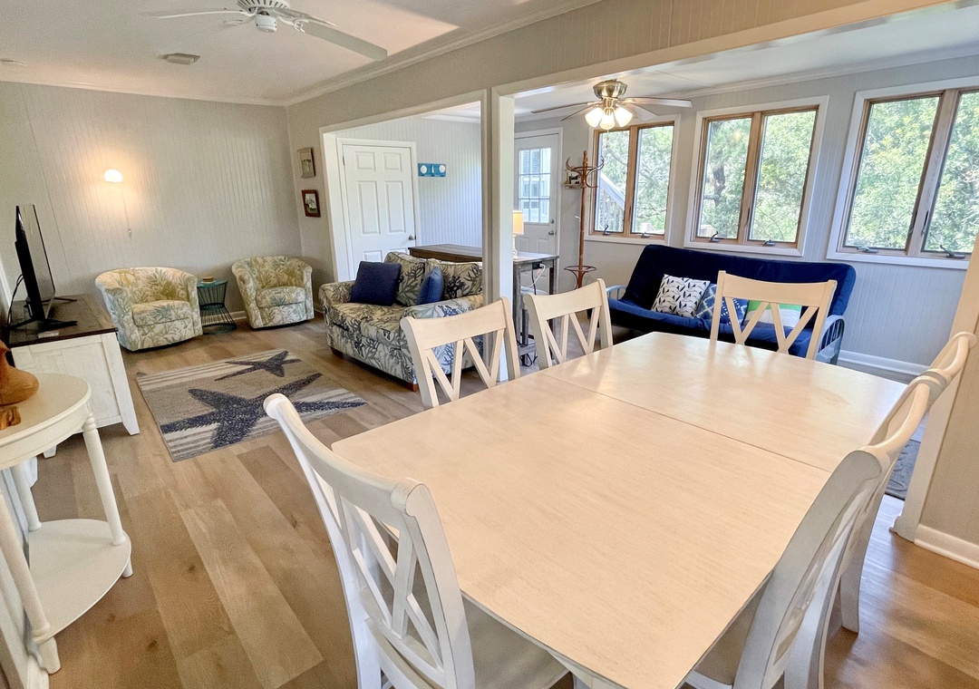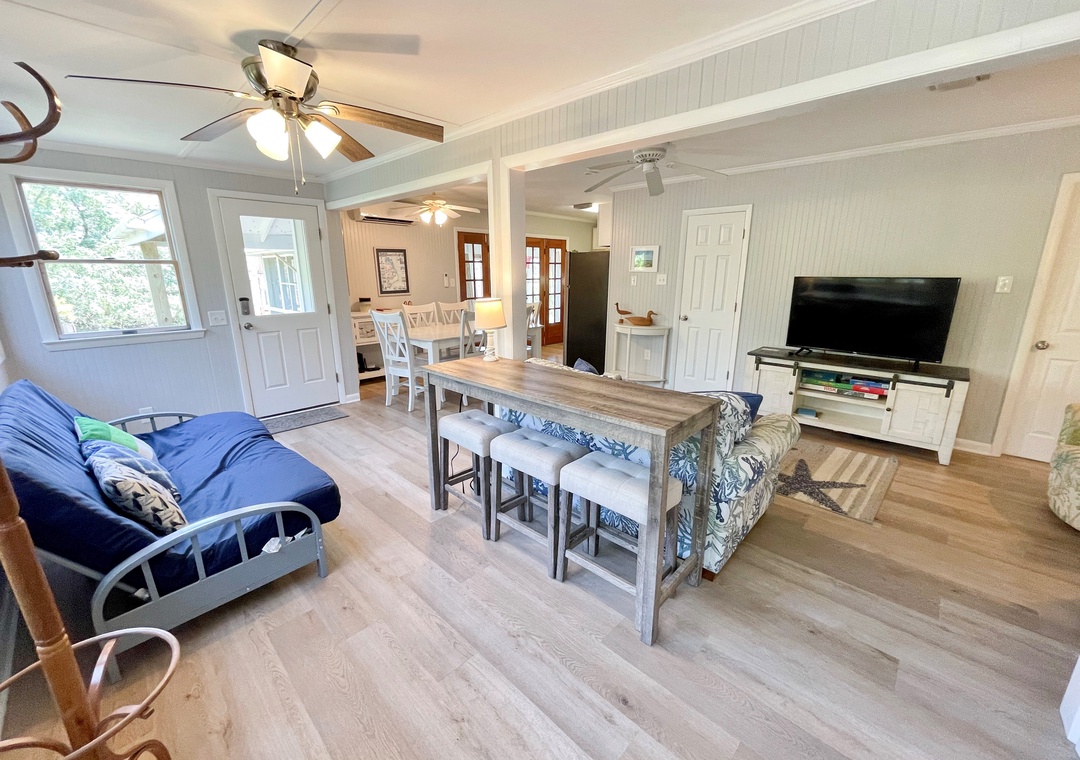 The Kith and Kin main house features a large open floor plan with French doors leading onto the spacious screened porch. The barn features a ground floor game room while housing 3 twin beds and half bath on the second floor.