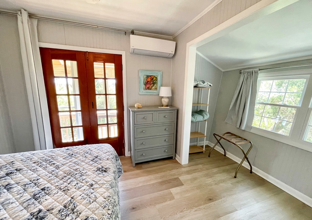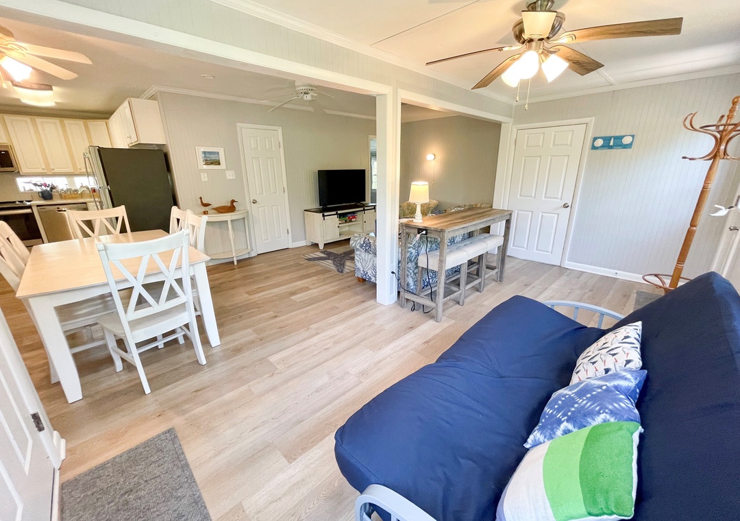 Main House: Open kitchen, dining, and living area with TV. Bedroom with Queen Bed with deck access. Bedroom with Bunk Bed and adjacent Half Bath. Bath with shower stall.