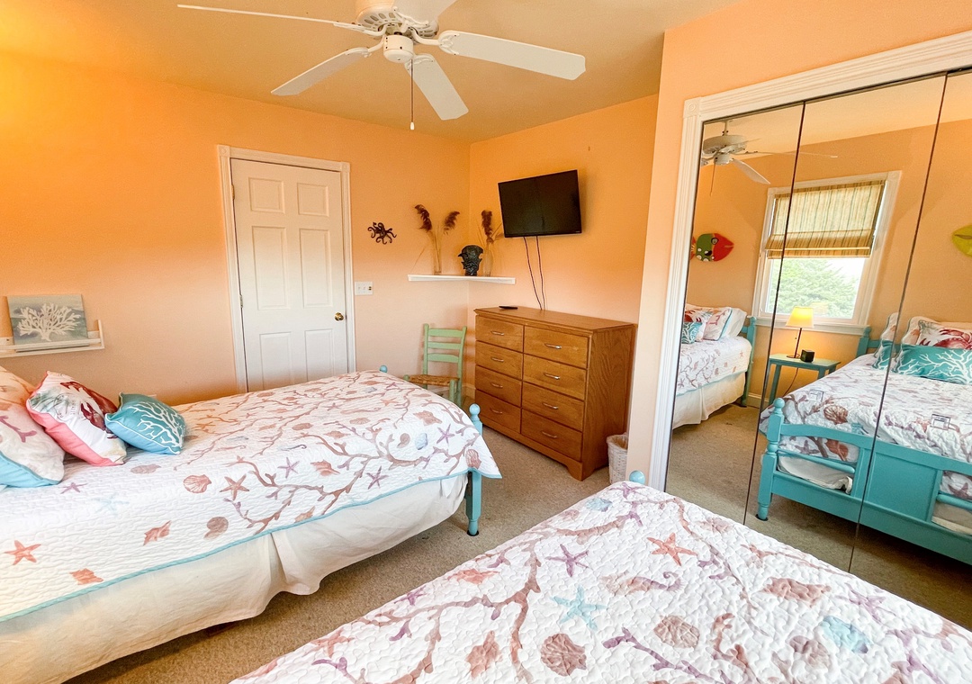 Second Floor: Bedroom with King bed, TV. Bedroom with two Twin beds, TV. Hallway bathroom with tub/shower.