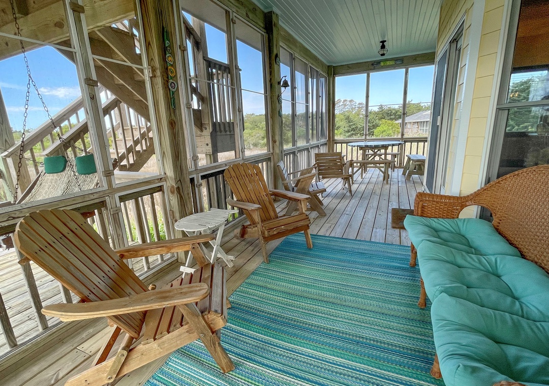 The exterior offers generous decking including a roof top deck, a large screened porch, picnic table, deck swing, hot/cold outdoor shower, park style charcoal grill and fish cleaning bench. Covered parking.