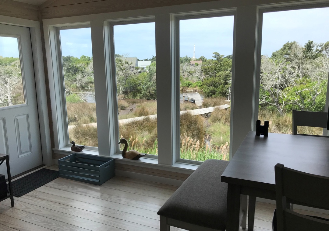 As guests of Terrapin Station, you will enjoy a comfortable walk or bike ride to village shops, galleries, restaurants and Silver Lake Harbor. A spacious rear den features seating and a dining table. A wall of windows overlooks the adjoining salt marsh. Experience amazing sunsets. Enjoy beautiful marsh views, home to egrets, heron and other wildlife. The den offers a comfortable work area for your computer needs (computer not included) and a stereo with blue tooth for streaming and CD player. A small rear deck offers an even closer view of nature. French doors in living area lead to a front covered porch, perfect for watching the world go by in this historic island neighborhood.