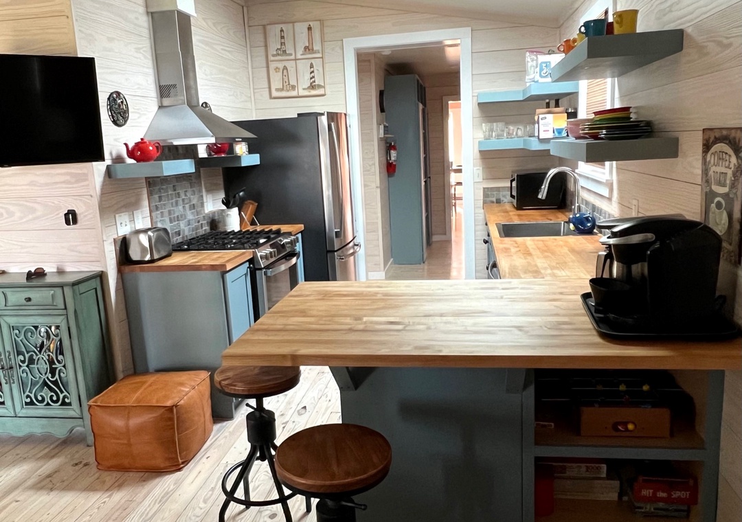 Terrapin Station offers all new furnishings, appliances, and cabinetry. The completely new chef’s kitchen features stainless steel appliances and a gas stove. Keurig and standard coffee maker.
