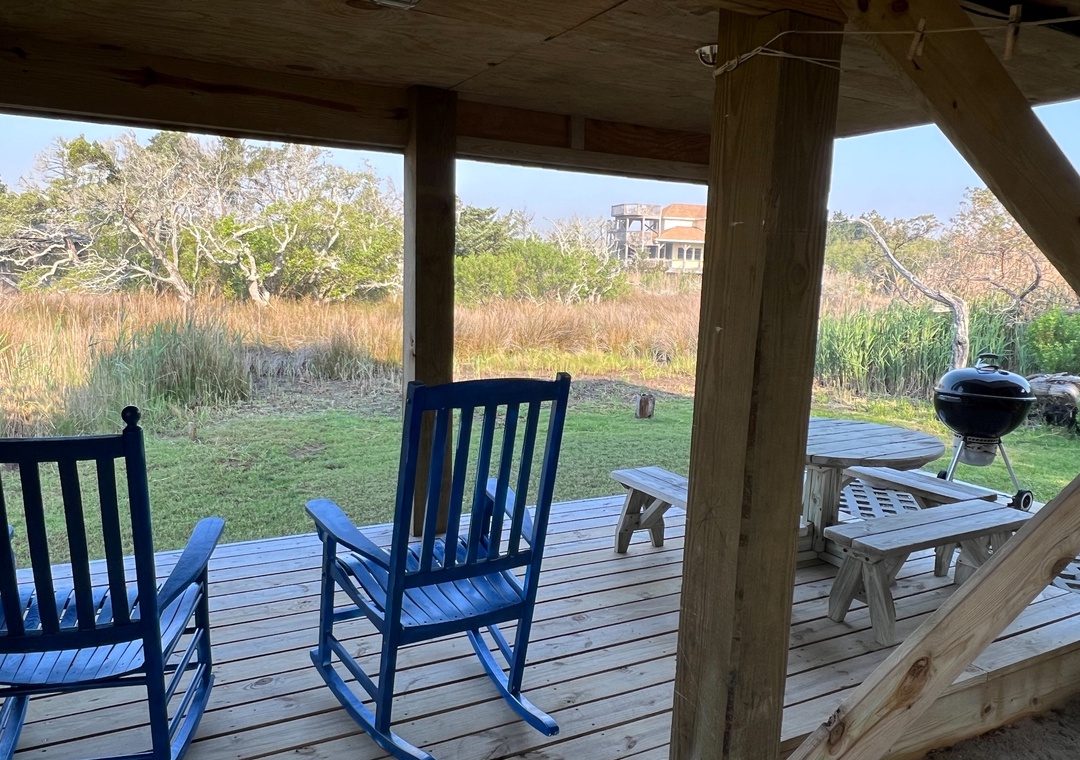 The exterior offers a covered front deck and hot/cold outdoor shower. The rear deck overlooks the salt marsh offering a perfect retreat for nature photographers. A covered deck under the home offers a grilling station with charcoal grill and outdoor dining area with a picnic table, bench and rocking chairs.