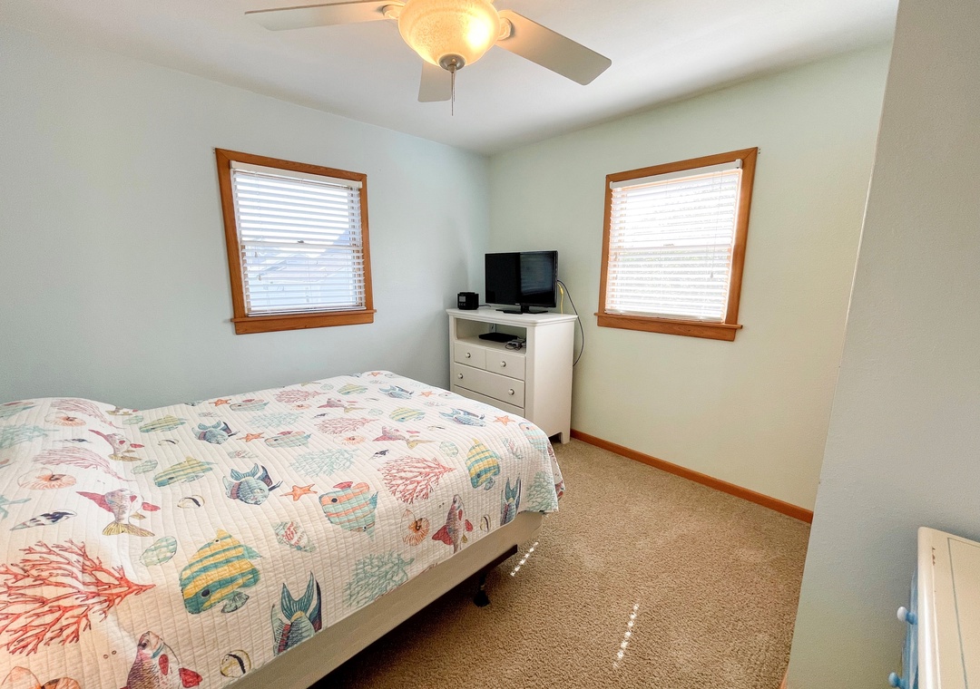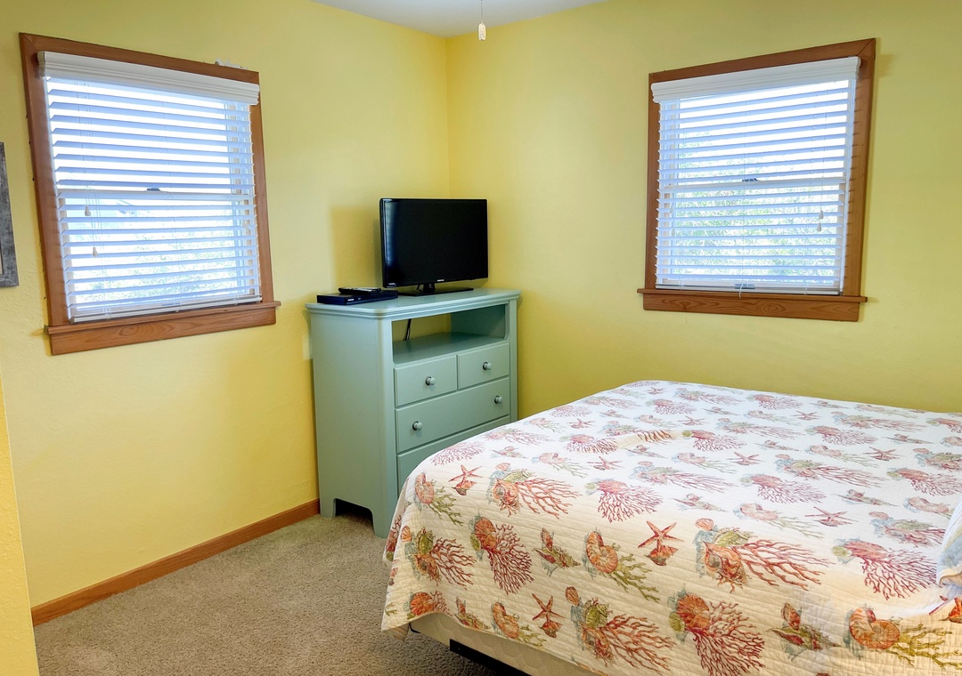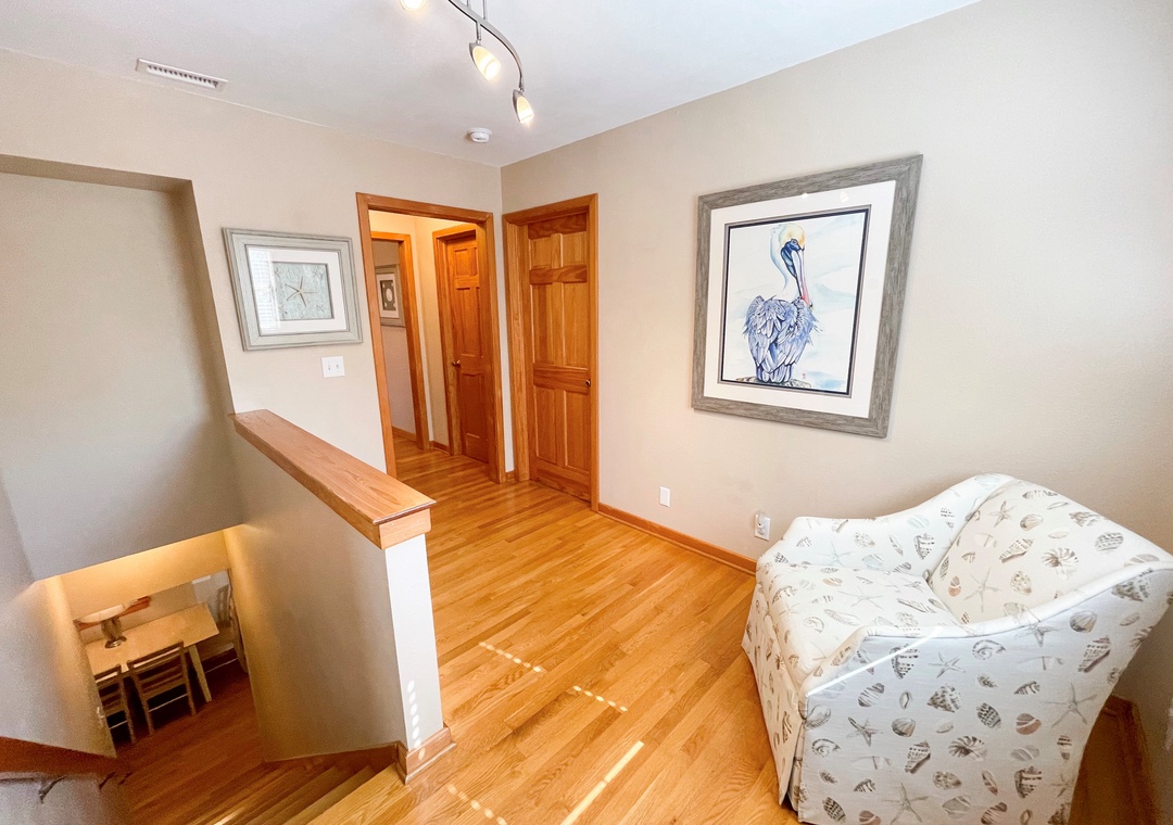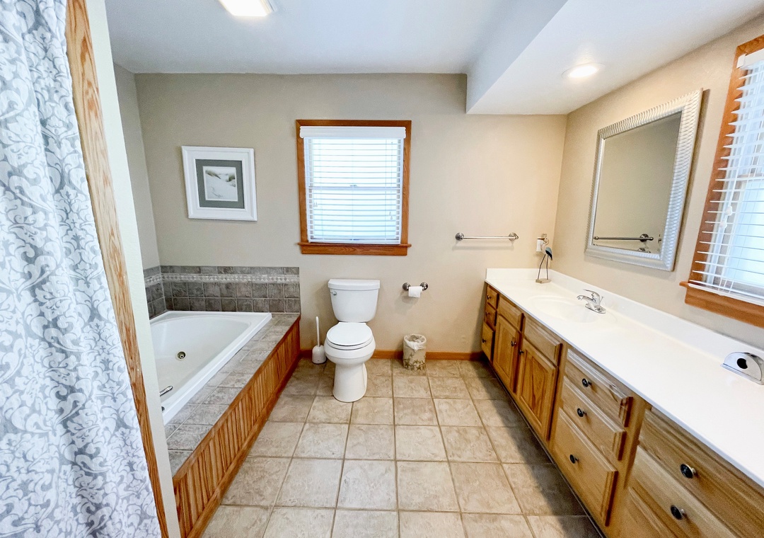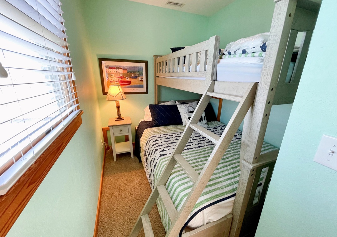 Second Floor: Two Bedrooms, each with a Queen bed, TV. Sleeping alcove with Pyramid Bunk Bed. Full bath with whirlpool tub and separate shower. Laundry closet.