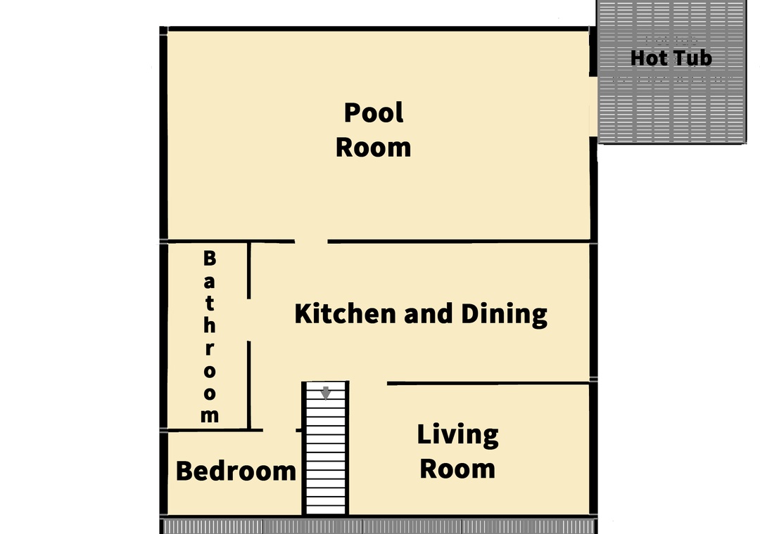 First Floor: Living Room with TV/DVD. Eat-in kitchen. Bedroom with Queen bed, TV. Full bath with tub/shower. Indoor pool accessed from kitchen or exterior.