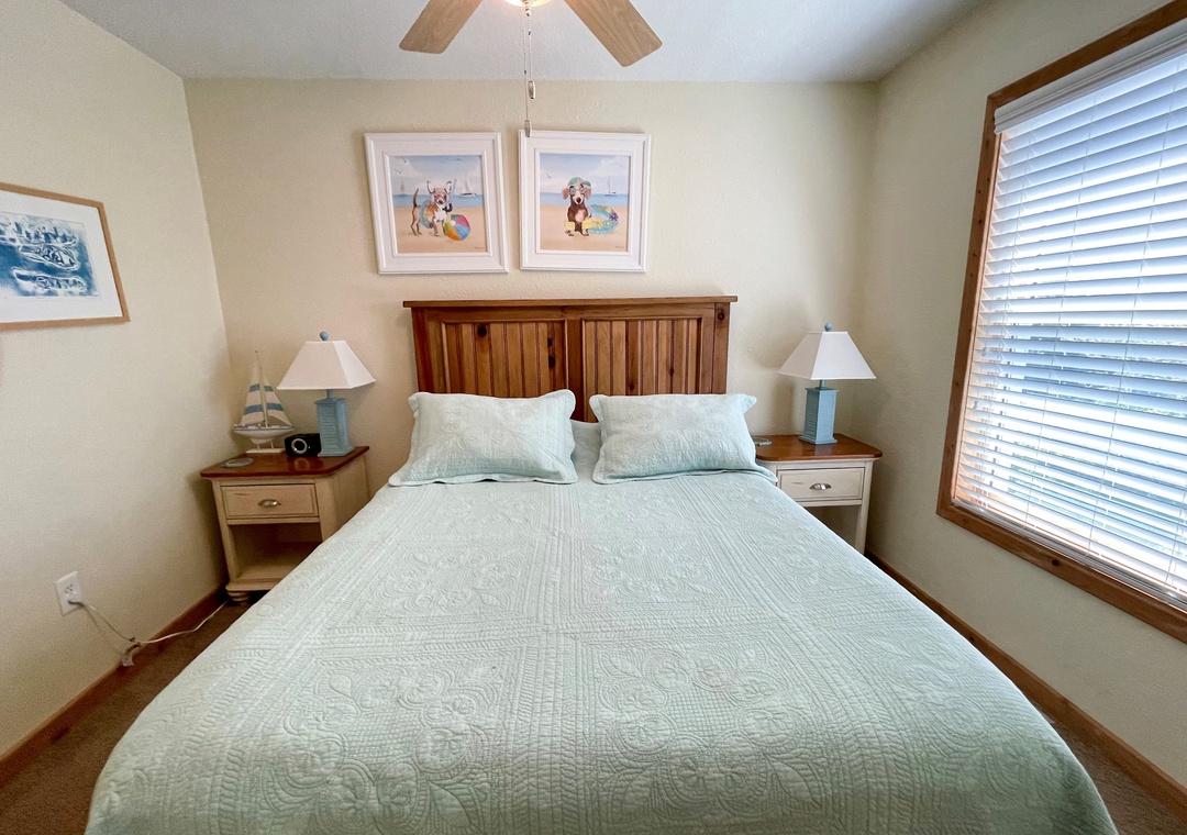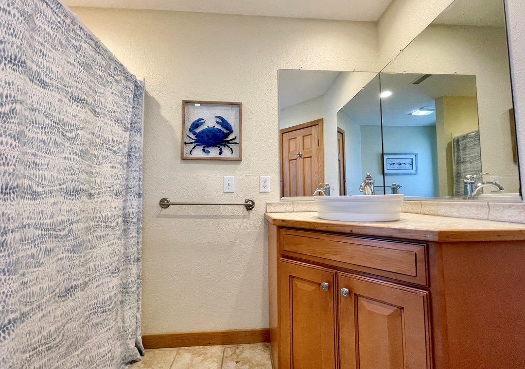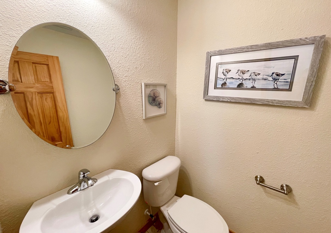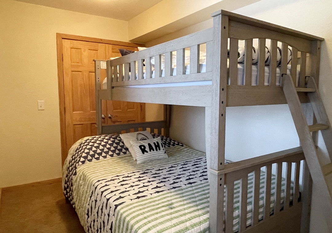 3 Bedrooms, 2.5 Baths: First floor has 2 bedrooms each with a Queen and shared bath. Second floor Primary Bedroom with King, TV, and private bath with shower. A small alcove on the first floor features a Pyramid Bunk Bed (Twin over Double) which offers flexible sleeping options (but does not allow occupancy over the 6 person limit).