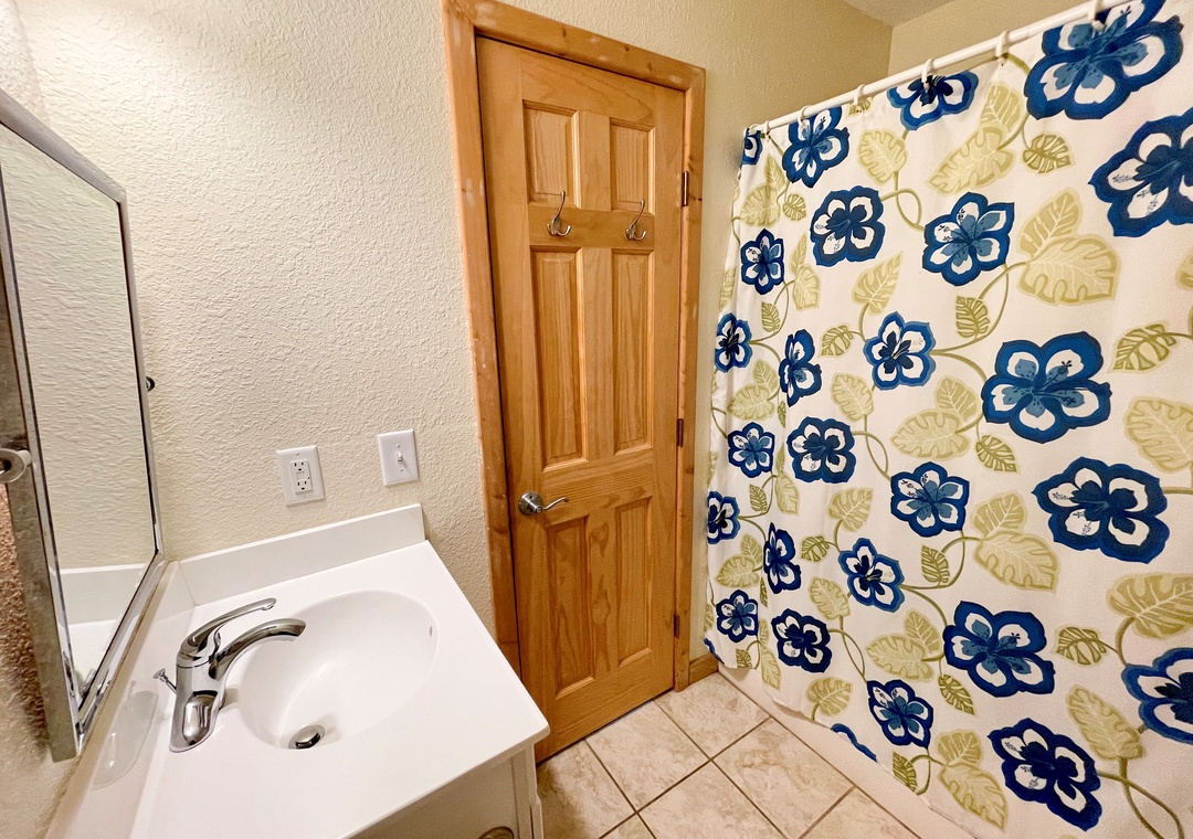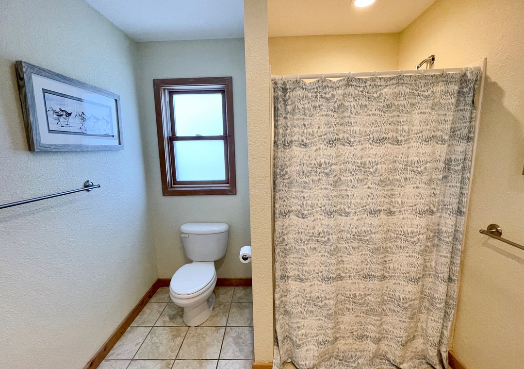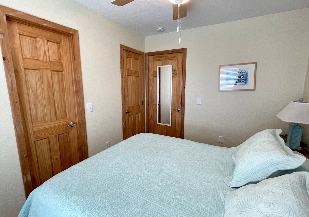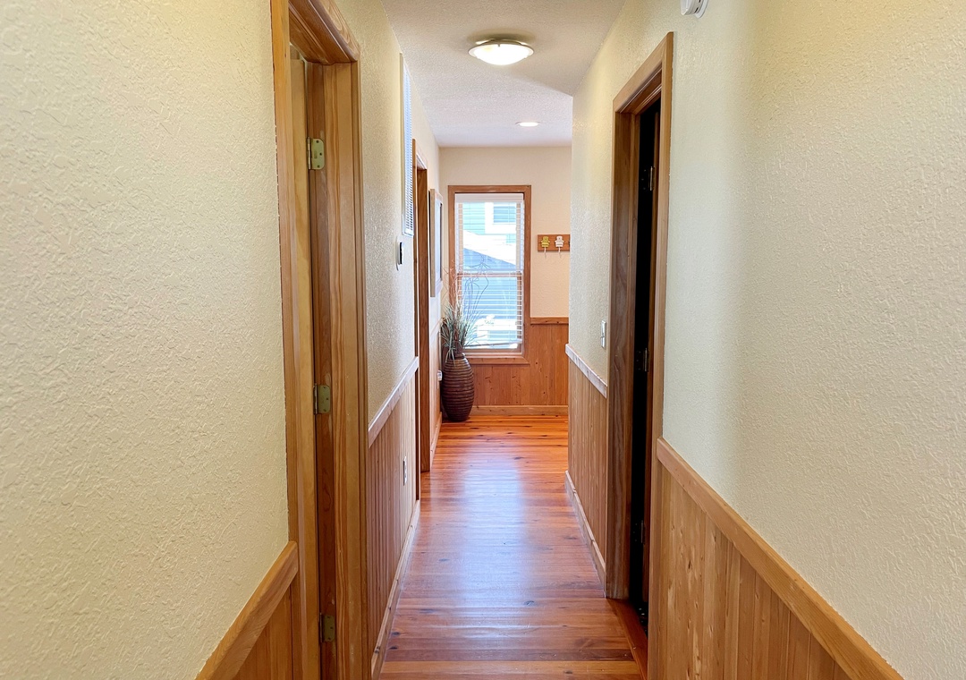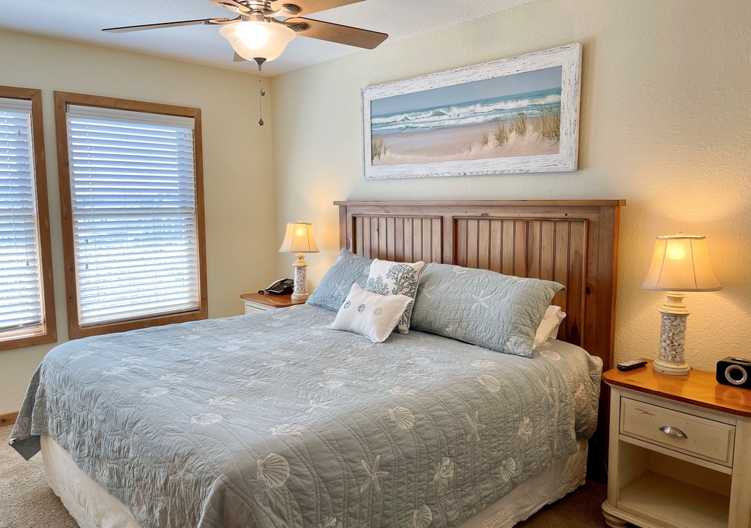 3 Bedrooms, 2.5 Baths: First floor has 2 bedrooms each with a Queen and shared bath. Second floor Primary Bedroom with King, TV, and private bath with shower. A small alcove on the first floor features a Pyramid Bunk Bed (Twin over Double) which offers flexible sleeping options (but does not allow occupancy over the 6 person limit).
