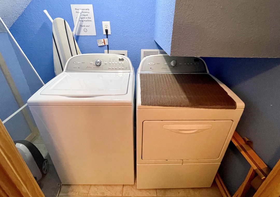 Amenities include complimentary SpaceX Starlink high-speed satellite Internet service, central air conditioning/heat, ceiling fans, 2 TVs, and a Blu-ray DVD player. The kitchen includes a wine refrigerator. Washer and dryer. Pack-N-Play. High chair.