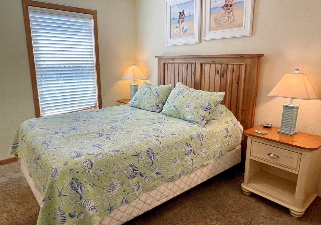 First Floor: Media Room with TV. Two Bedrooms, each with a Queen bed and shared Bath with tub/shower. Laundry closet.