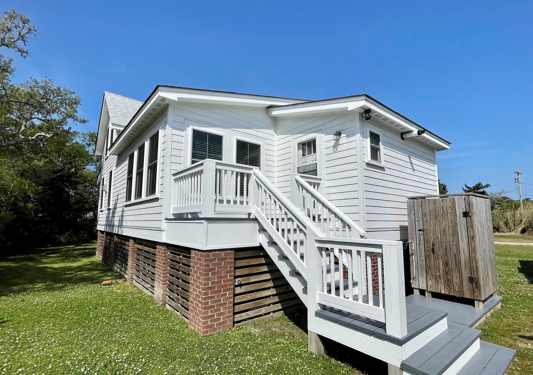 Beverly’s House was built in approximately 1900 and is on the National Register of Historic Homes. This home was built by Charlie Scarborough who also built several important structures on the Island including the Oddfellows Lodge, the Wahab Villlage Hotel (now Blackbeard’s Lodge), the original Methodist Church, the William Ellis Williams House on the water at the Community Square, and Captain Thomas’ house on the other side of Silver Lake.