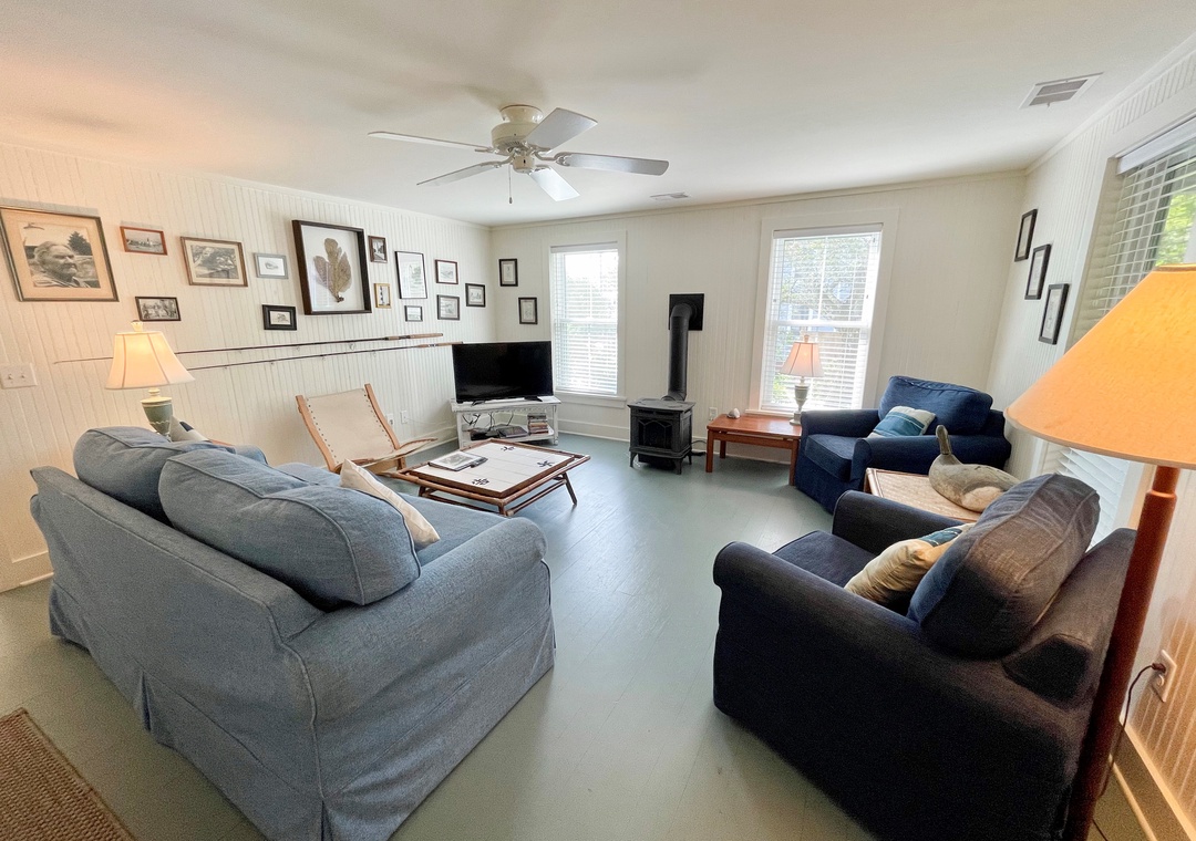 Amenities include central air conditioning/heat and ceiling fans. One smart TV with cable service. Complimentary wireless internet access. Gas fireplace (Off-Season Only). The kitchen offers a gas range and electric oven. Washer and dryer.