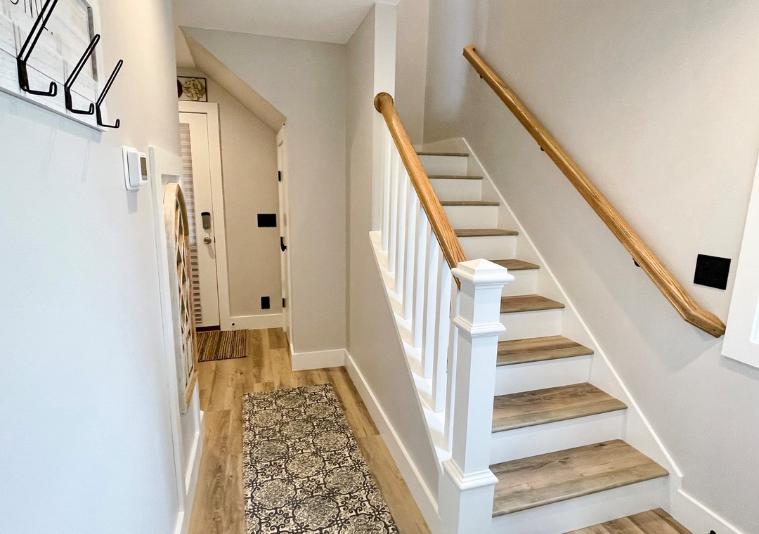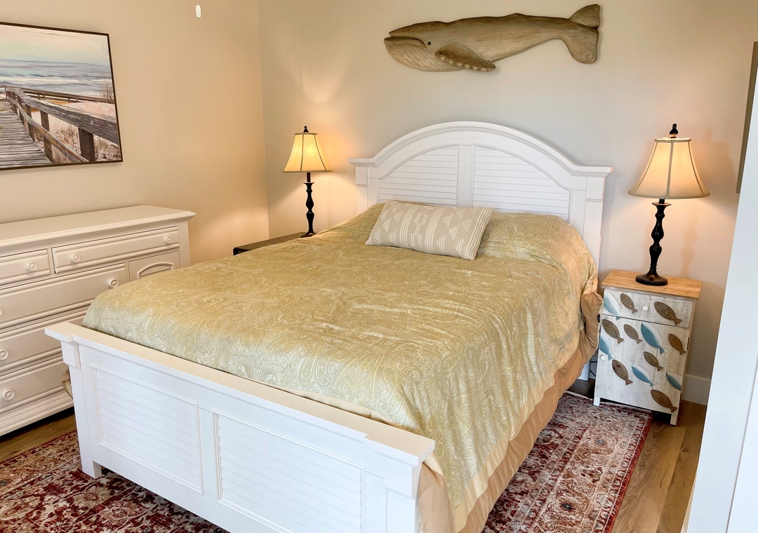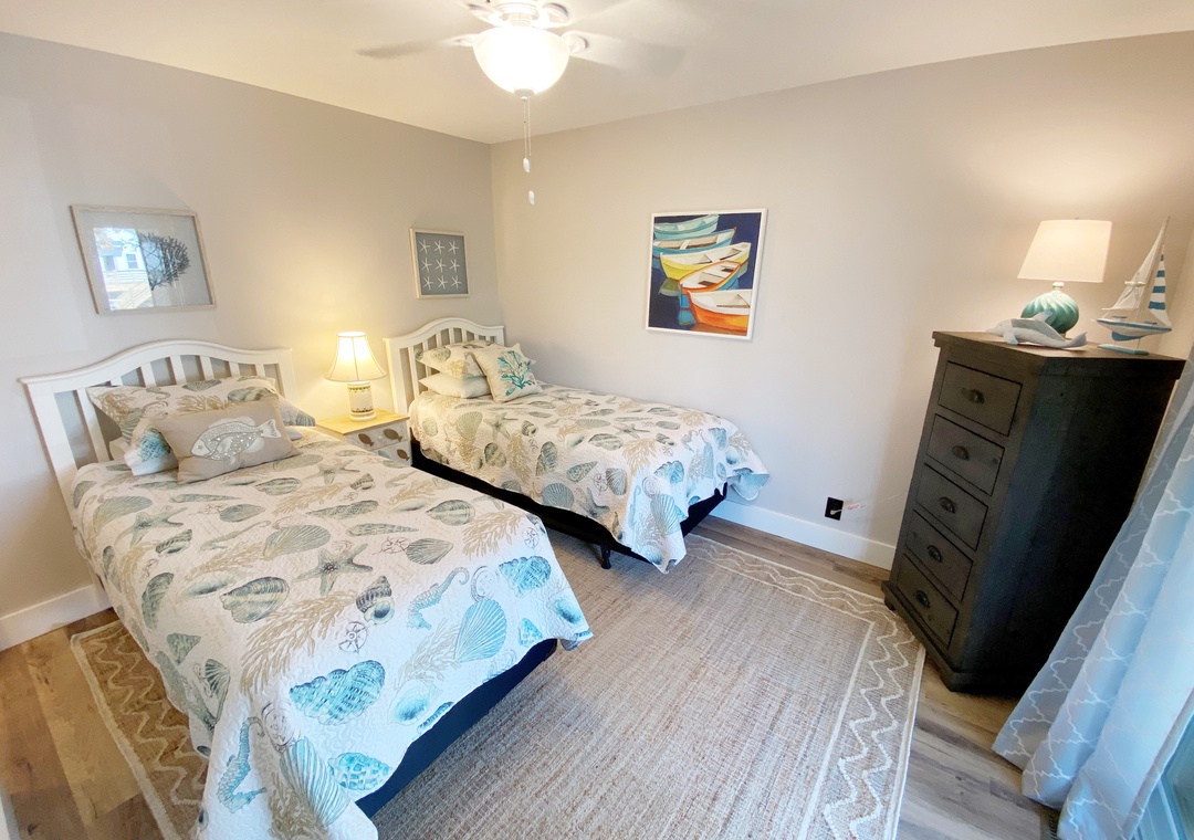 First Floor: Two Bedrooms. Primary Bedroom with Queen. Primary Bedroom with 2 Twins. Both Primary Baths have a tub/shower. Laundry closet.