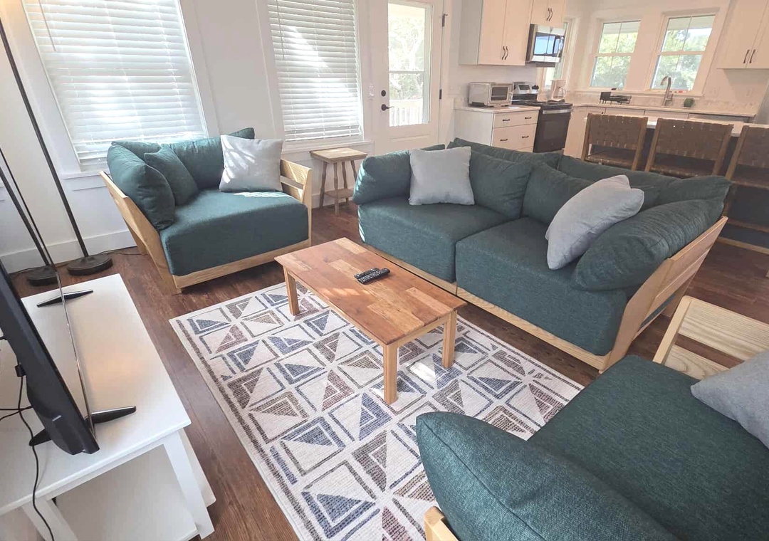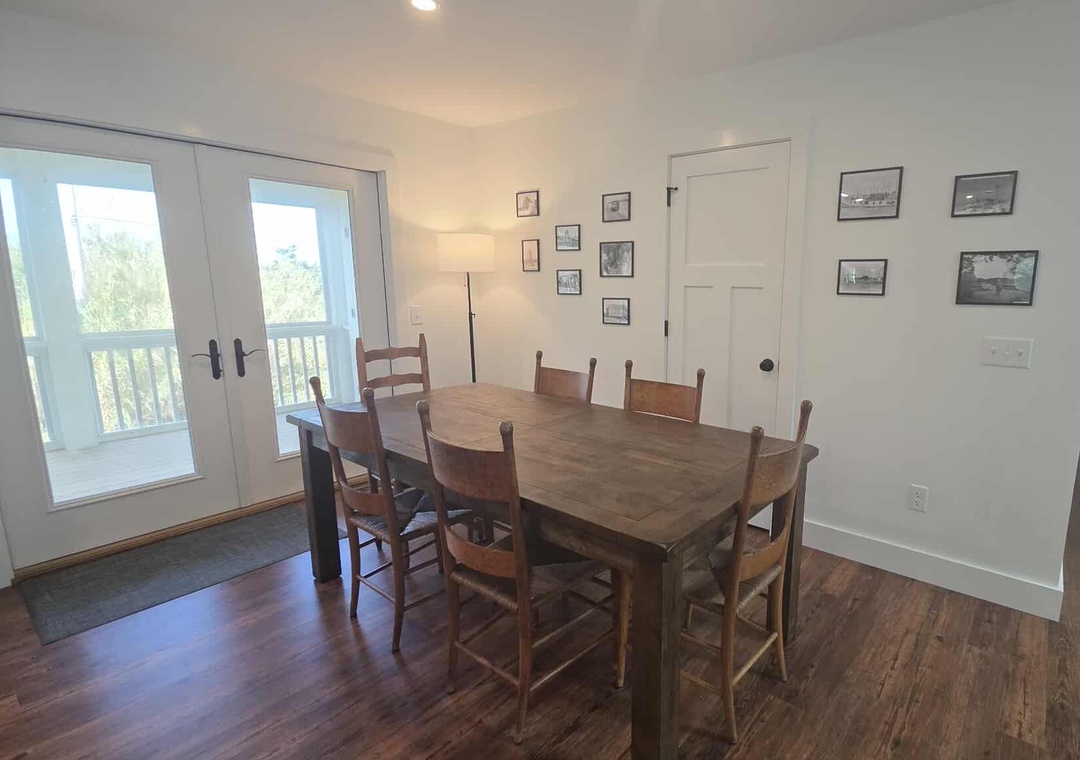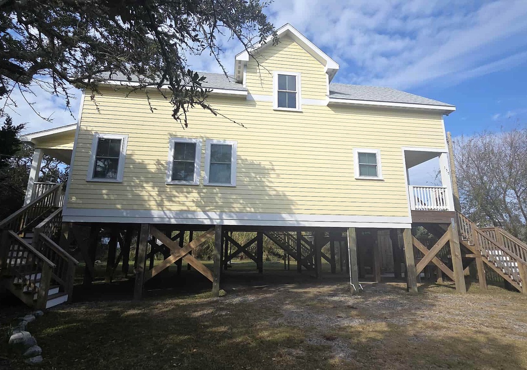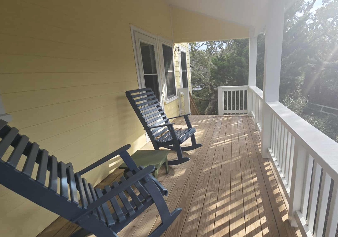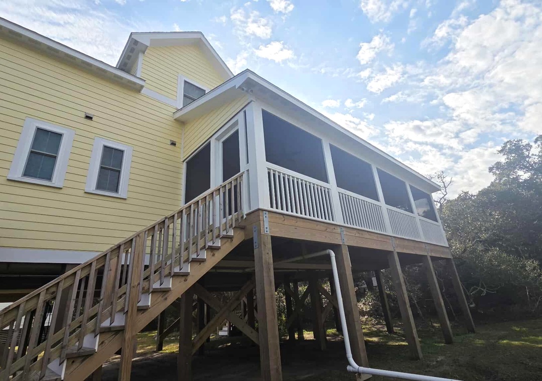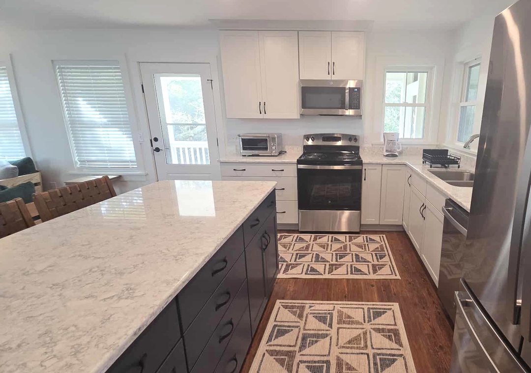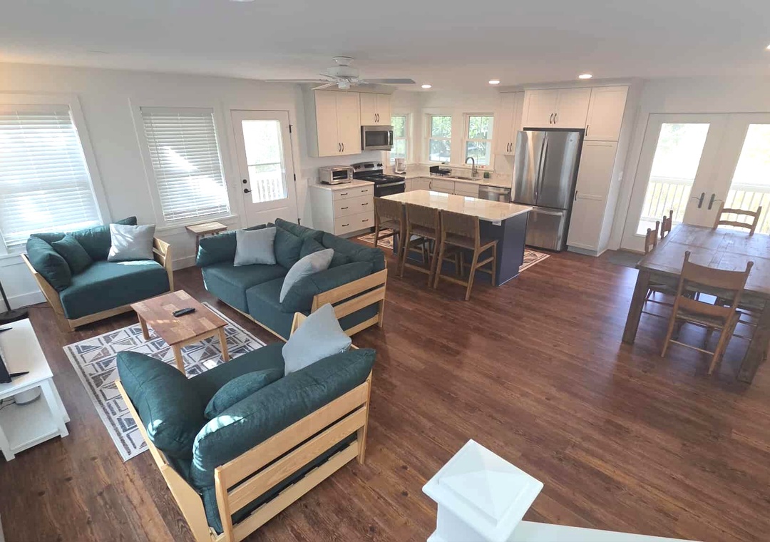 First Floor: Master Bedroom with Queen and Master Bath with tiled shower only. Open Floor Plan Living Room, Kitchen, Dining Area with Access to Deck and Screened Porch. Half Bath.