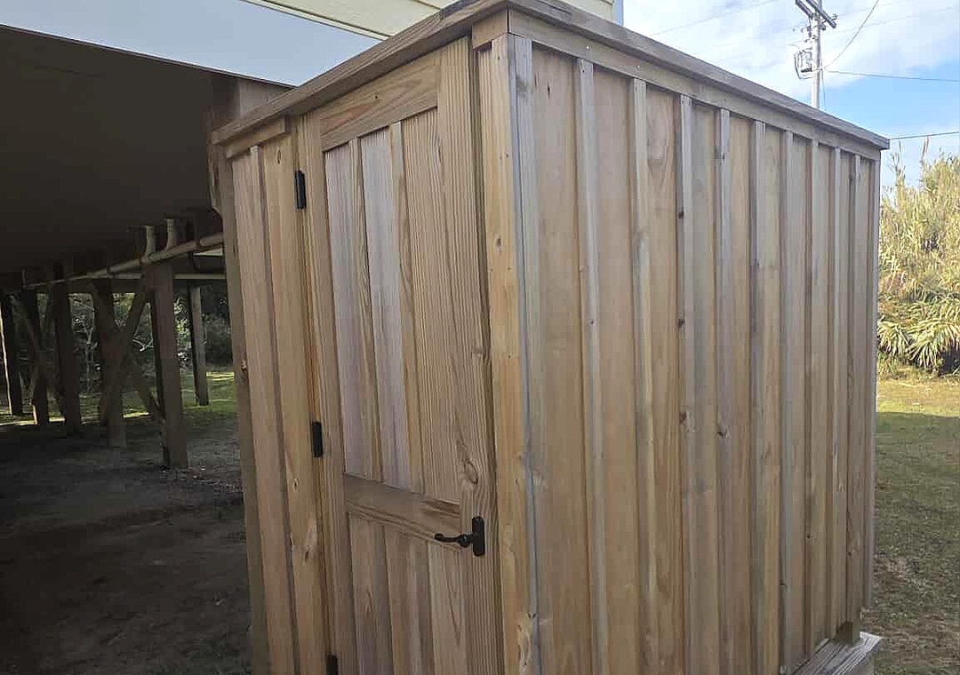 The exterior offers a deck, a screened porch with ceiling fan, covered parking, picnic table, and outdoor shower.