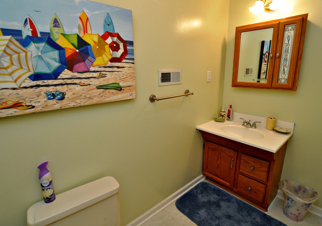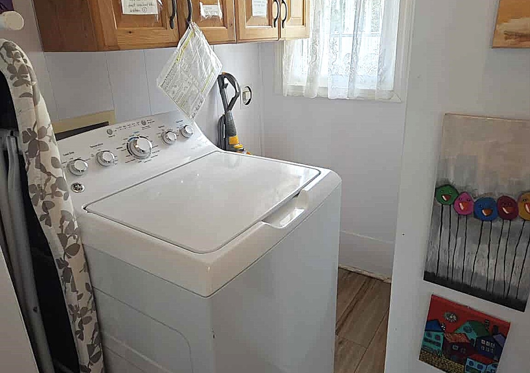 First Floor: Open floor plan. Living area, Genie DVR/DVD, and Queen Sleeper Sofa. Eat-in kitchen. Bath with tub/shower. Laundry room.