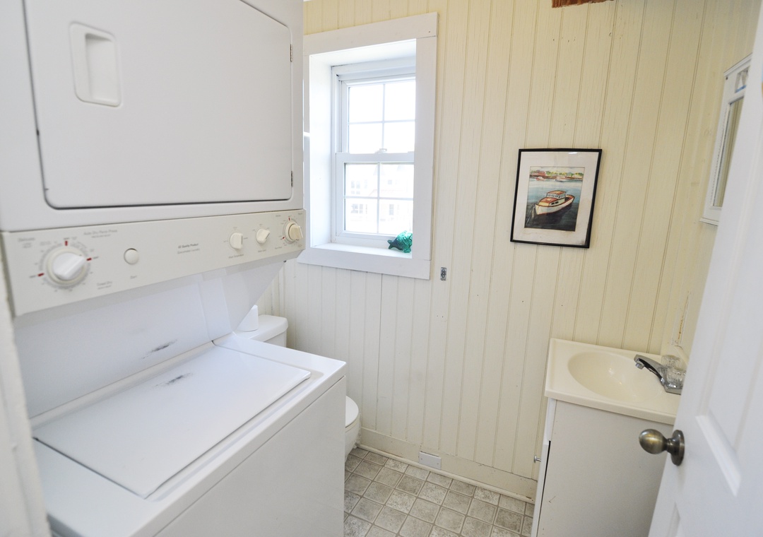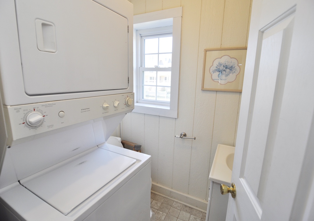 Second Floor: Open kitchen, dining and living area with TV. Bedroom with Queen bed and Pyramid Bunk (queen on bottom, twin on top). Bedroom with 1 Double bed and 1 Queen. Hallway Bath with tub/shower. Half Bath with stackable washer/dryer.
