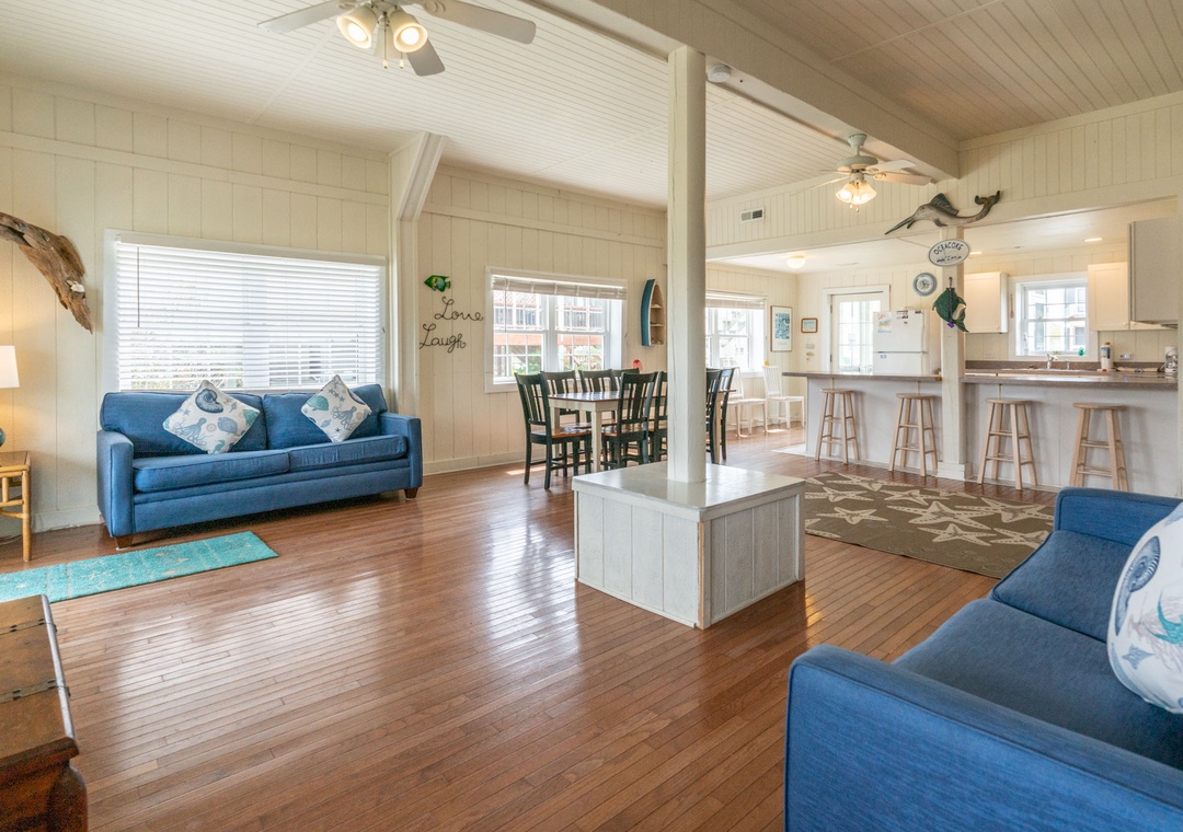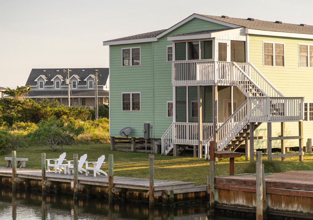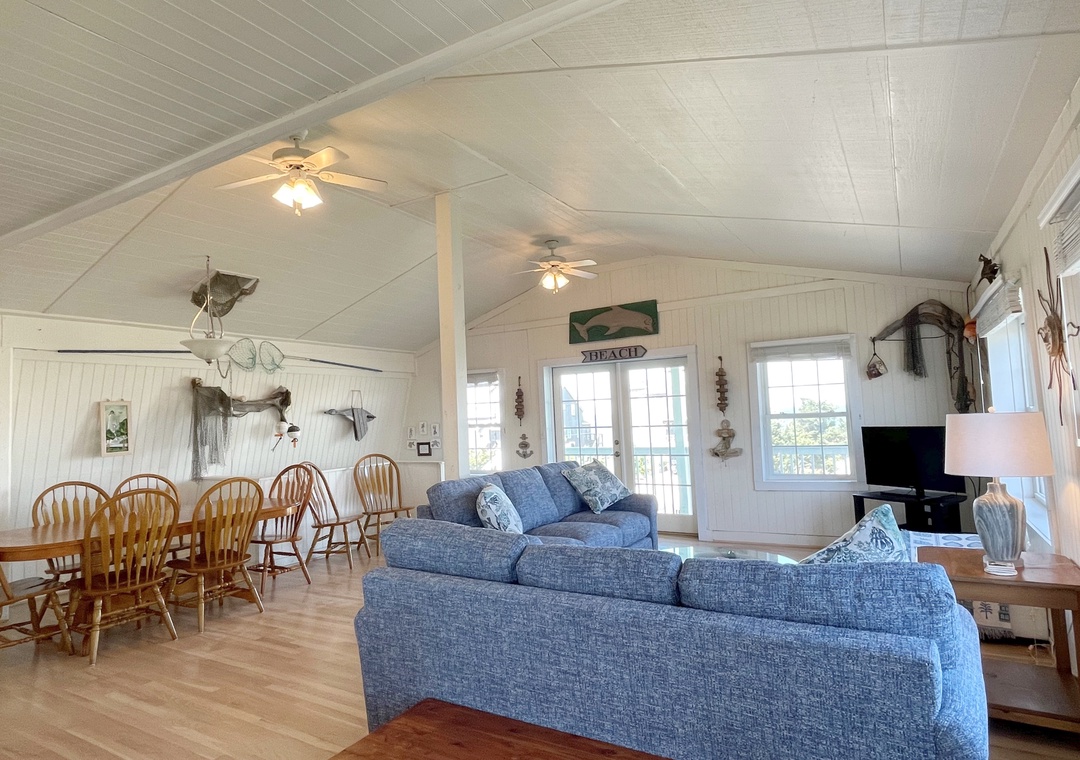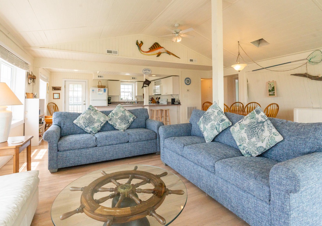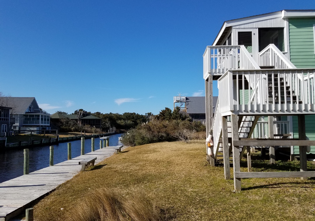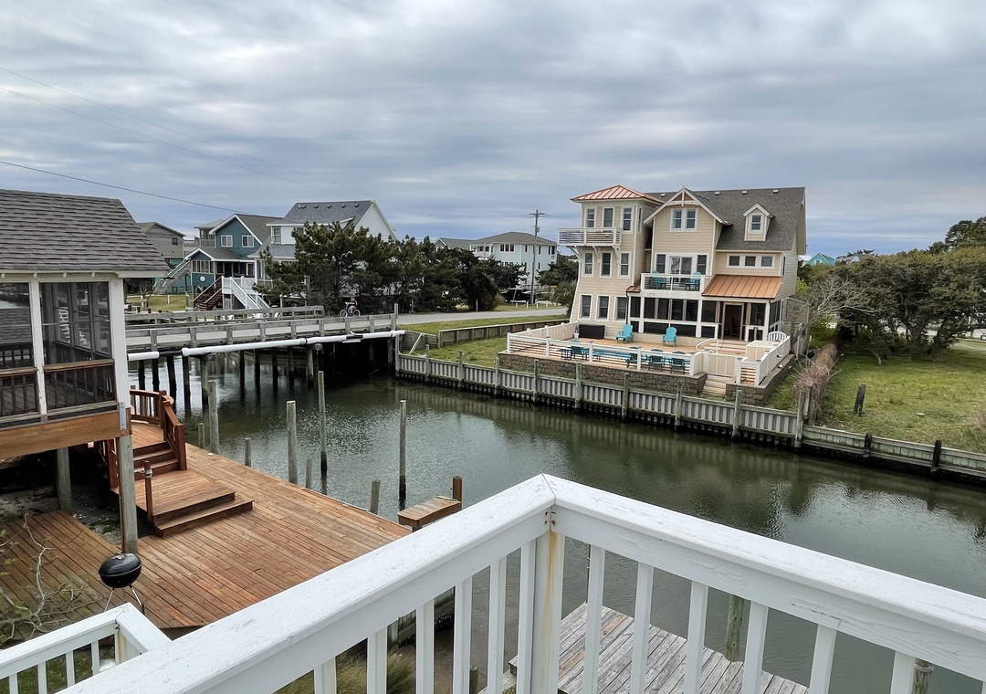 This large Ocracoke home offers wonderful accommodations for a large family. Enjoy the convenience of two separate kitchens and living areas. Take in the views of either the backyard canal with boat dockage or Pamlico Sound views across the street. The screened porches and decks provide relaxation in a comfortable outdoor setting.