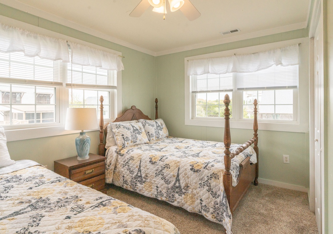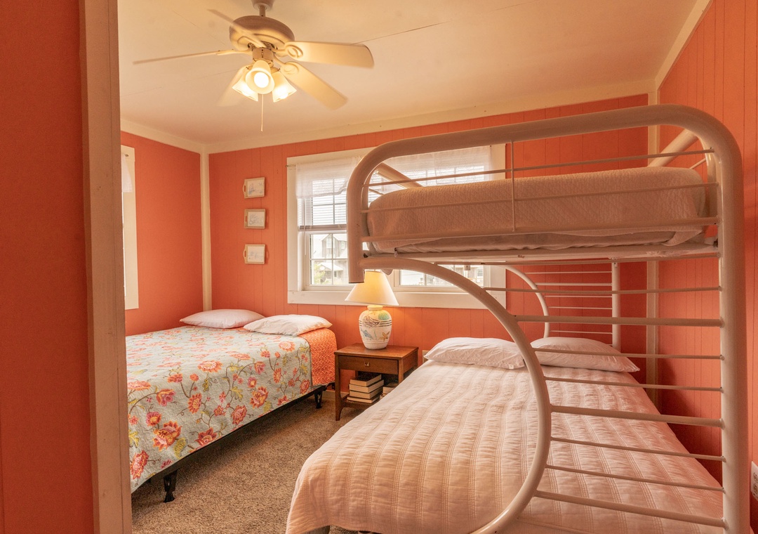4 Bedrooms, 2 Full and 2 Half Baths. Bedding: 1 with Queen, 1 bedroom with 1 Double and 1 Queen, 1 with Queen and 1 Pyramid Bunk ( twin over queen). 1 bedroom with 1 Double and 1 Queen.