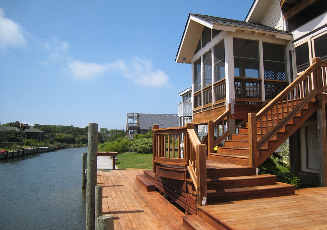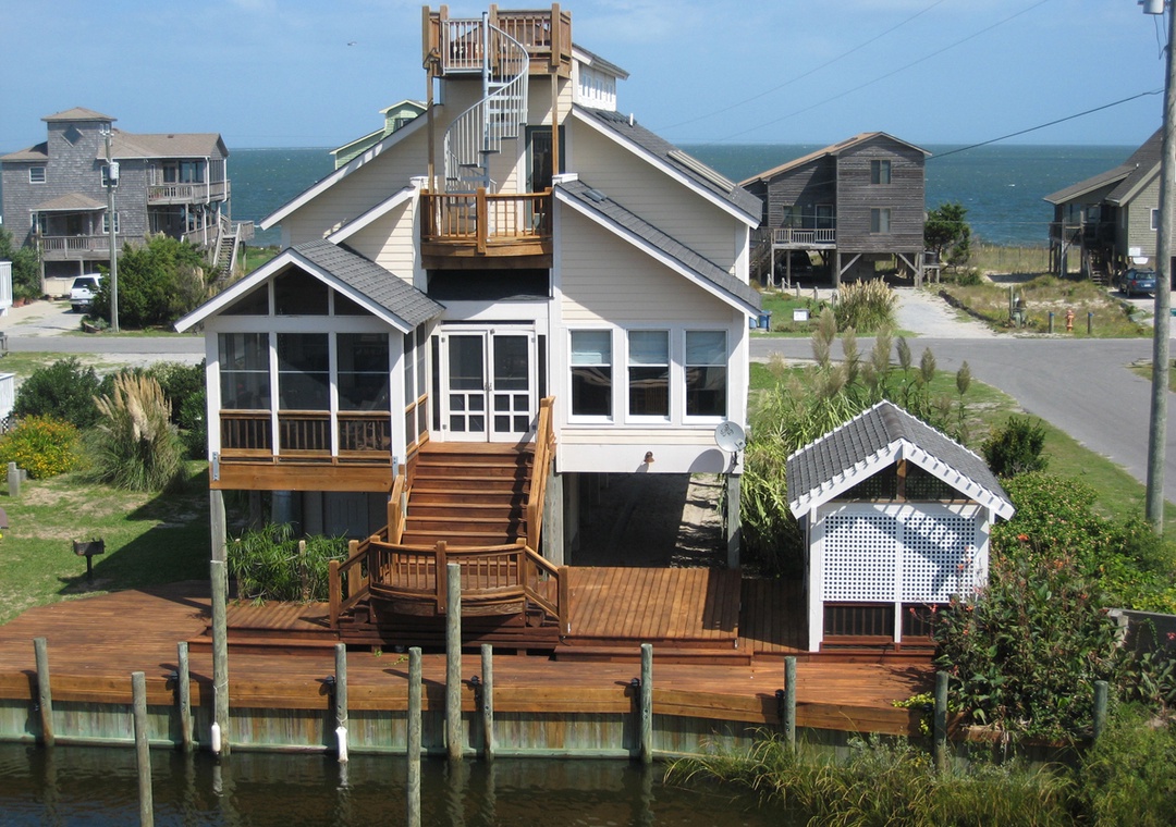 This Ocracoke Island vacation home is an artistic expression blending architectural beauty with its natural canal front surroundings. Reflecting the owners' artistic talents this gallery style home with cathedral ceilings showcases a unique decor attentive to the selective vacationer. Relax and stargaze from the sky deck.