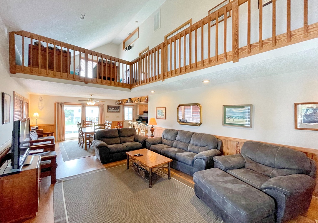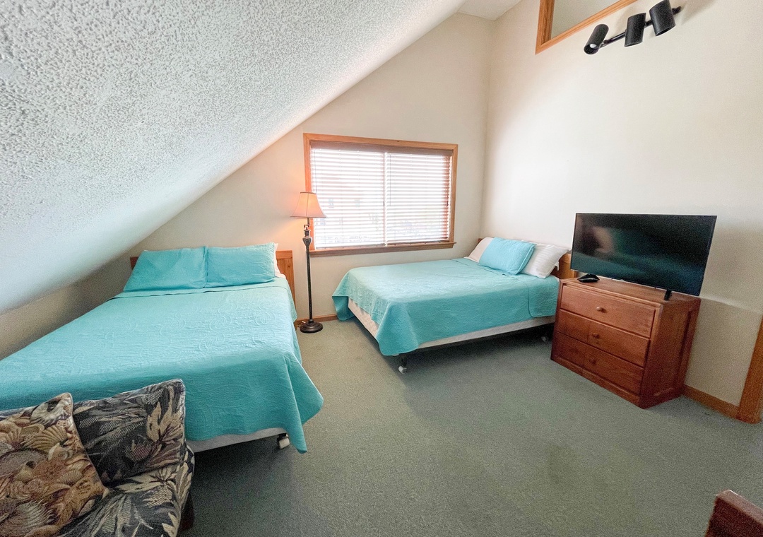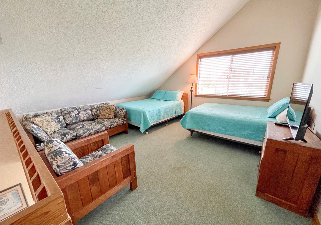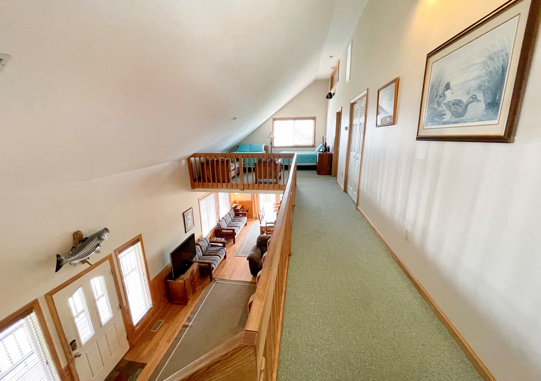 Second Floor: Bedroom with King bed and Bedroom with Queen bed which share a Bath with tub/shower. Open Loft Sleeping Area with two Double beds, TV.