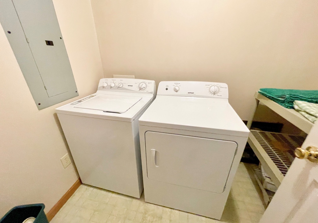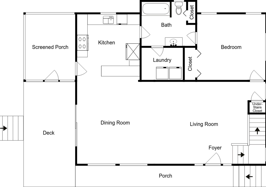 First Floor: Open kitchen, dining and living area with TV/DVD. Bedroom with King bed and bath with tub/shower and laundry closet.