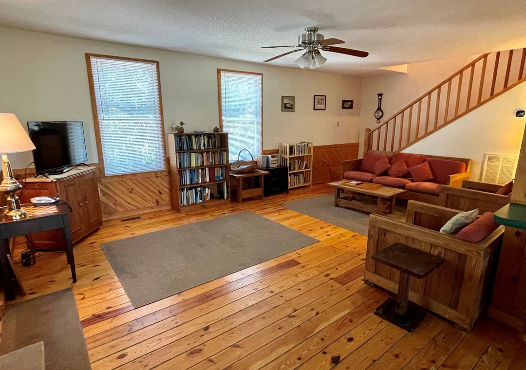 First Floor: Open kitchen, dining and living area with TV/DVD. Pyramid Bed (double on bottom and twin on top) with Trundle, TV. Bath with tub/shower. Laundry Room.