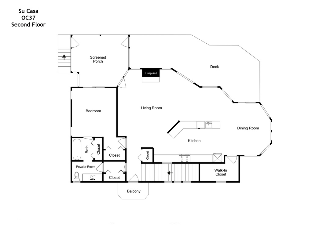 Second Floor: Open kitchen, dining and living area with TV. Primary Bedroom with King Bed, Full Bath.