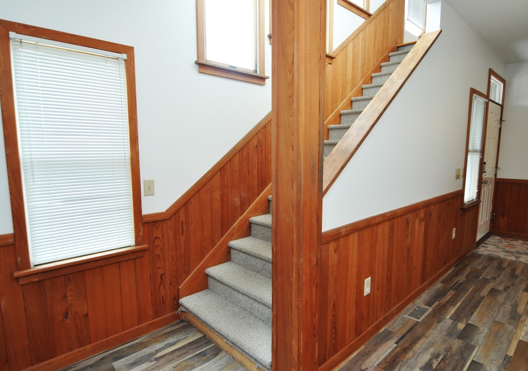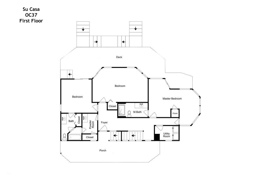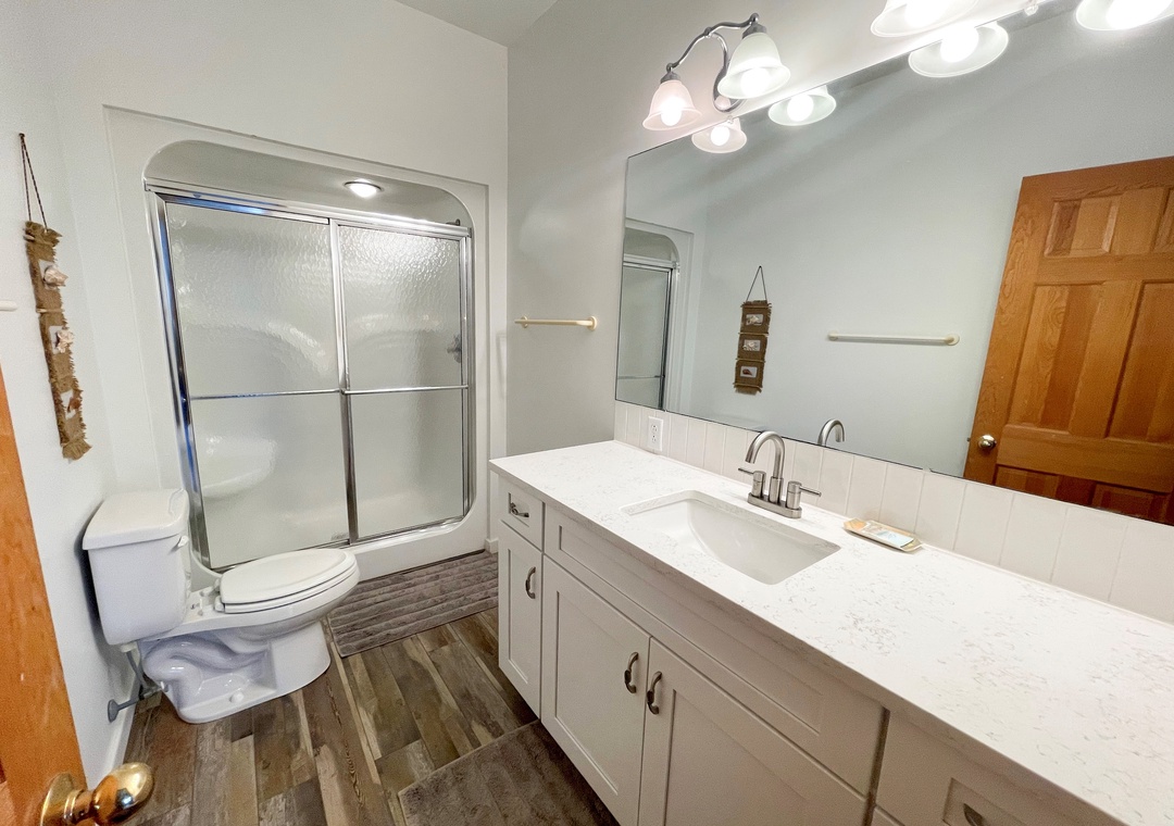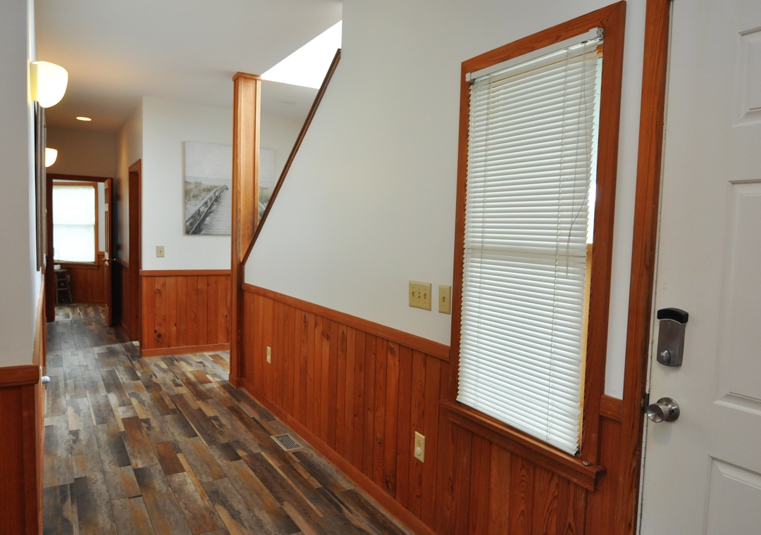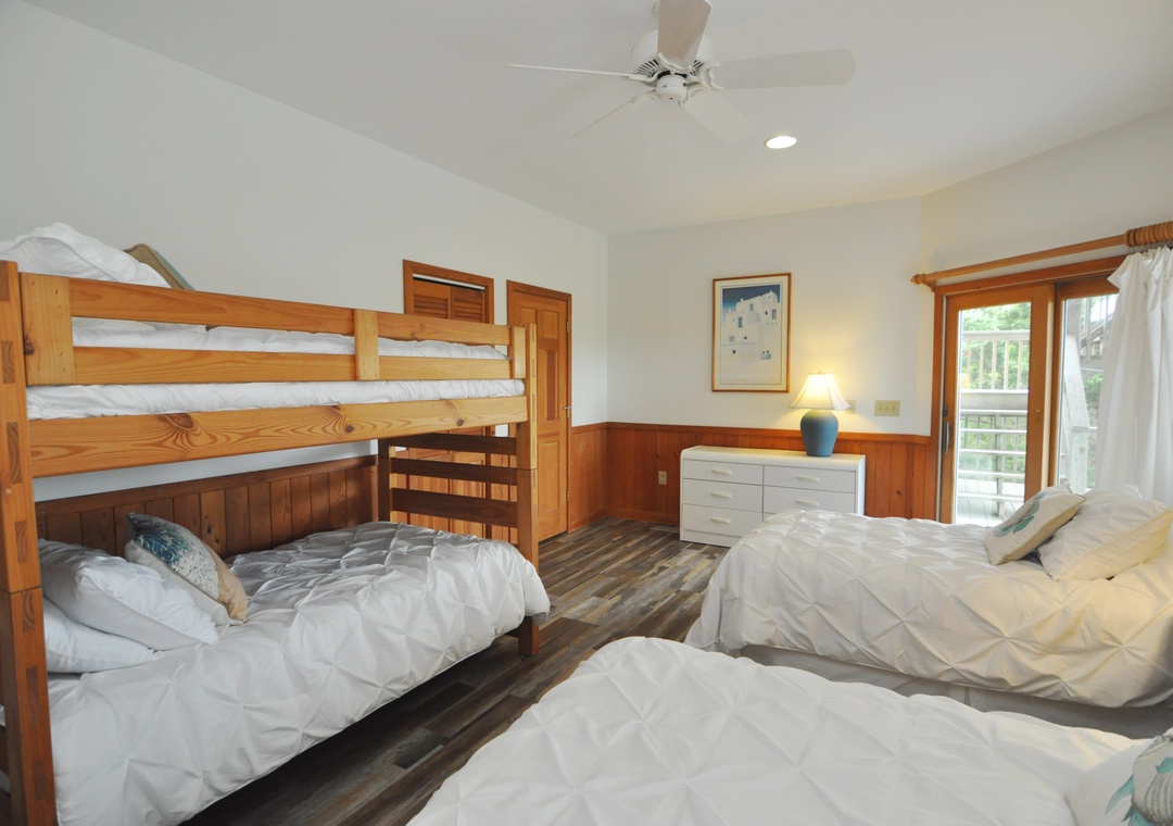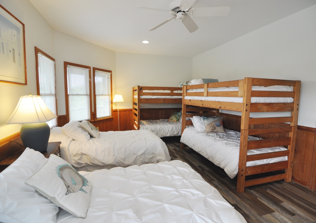 First Floor: Primary Bedroom with Queen Bed and Futon. Bedroom with King Bed. Shared Bath with Shower. Bedroom with Two Twins and Two Bunk Sets. Full Bath. Laundry Room. Half Bath.