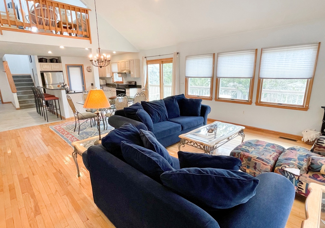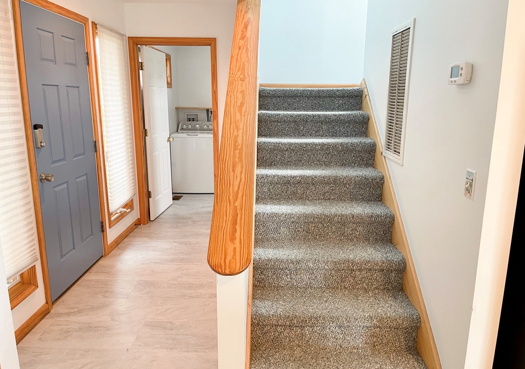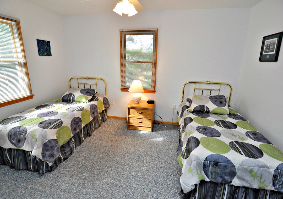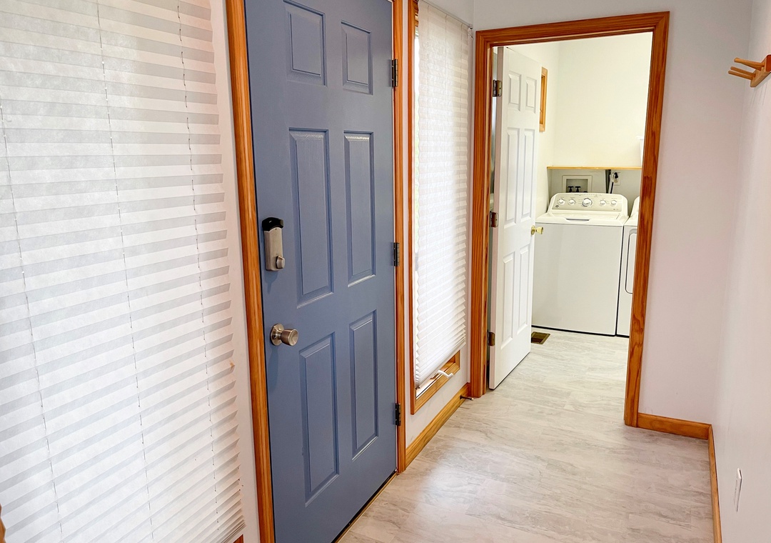 First Floor: Open kitchen, dining and living area with TV. Bedroom with Queen Bed, TV. Bedroom with two Twin Beds, TV. Shared Bath with tub/shower. Laundry Room with attached Half Bath.