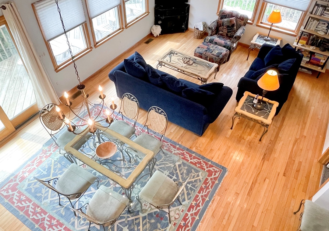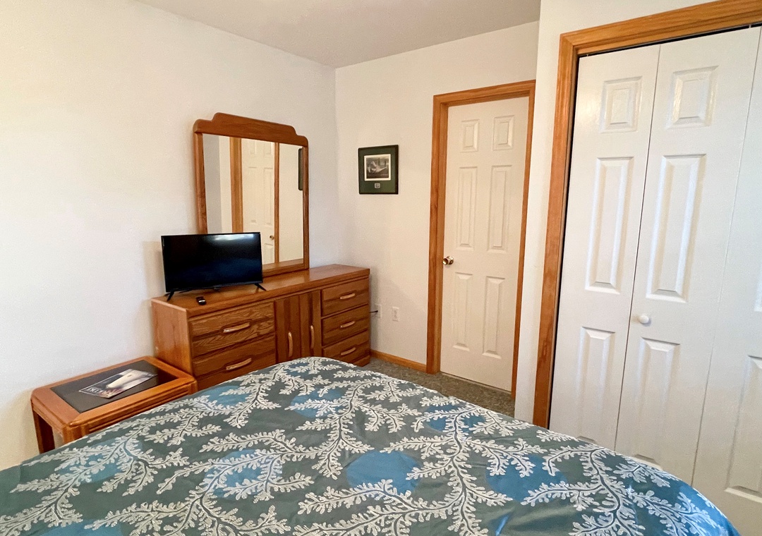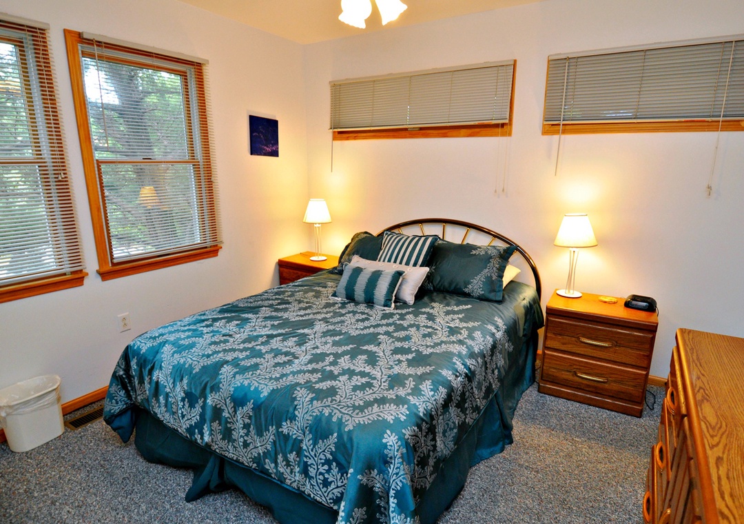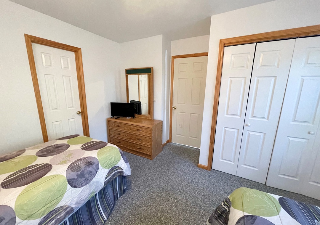 First Floor: Open kitchen, dining and living area with TV. Bedroom with Queen Bed, TV. Bedroom with two Twin Beds, TV. Shared Bath with tub/shower. Laundry Room with attached Half Bath.
