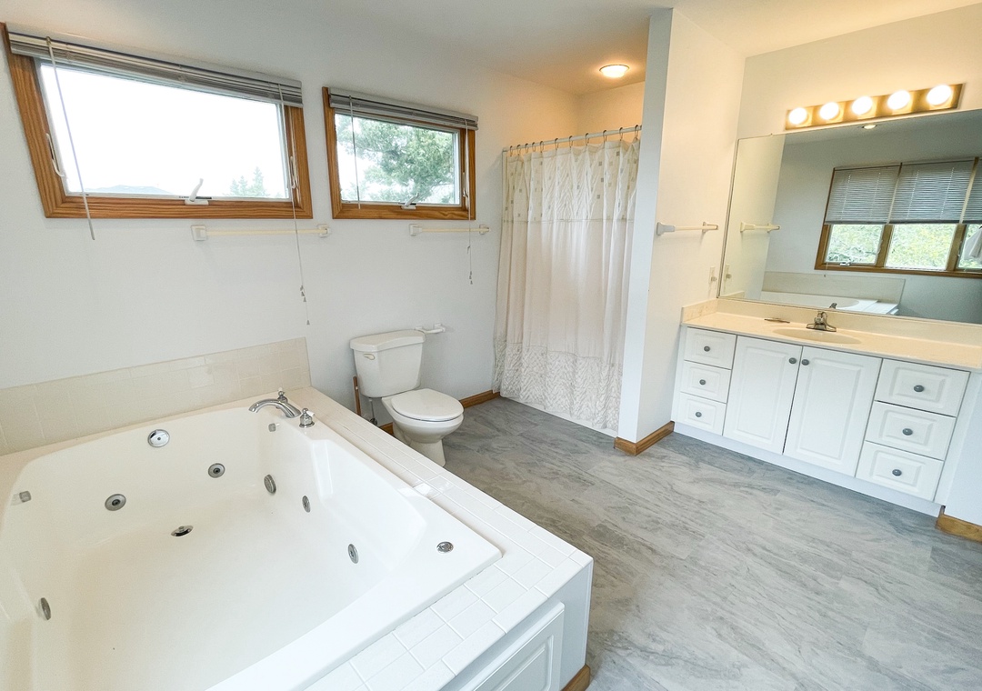 Second Floor: Primary Bedroom with King Bed, TV, and Primary Bath with whirlpool tub and separate shower. Sitting Area with sink.