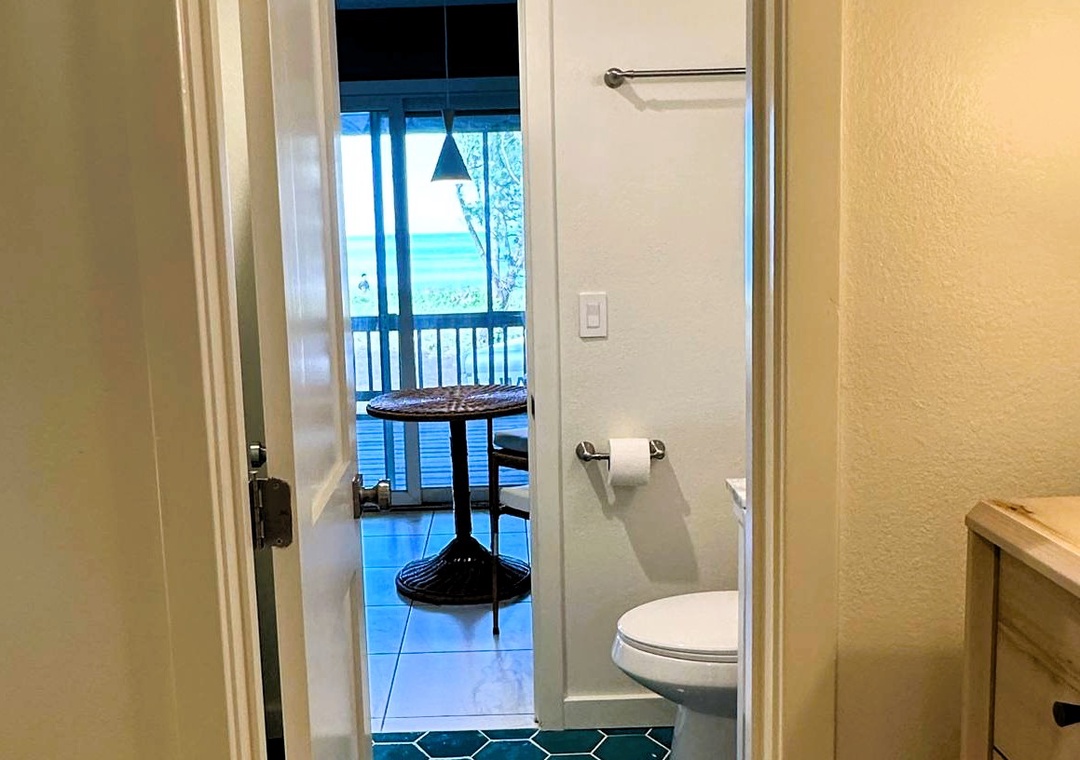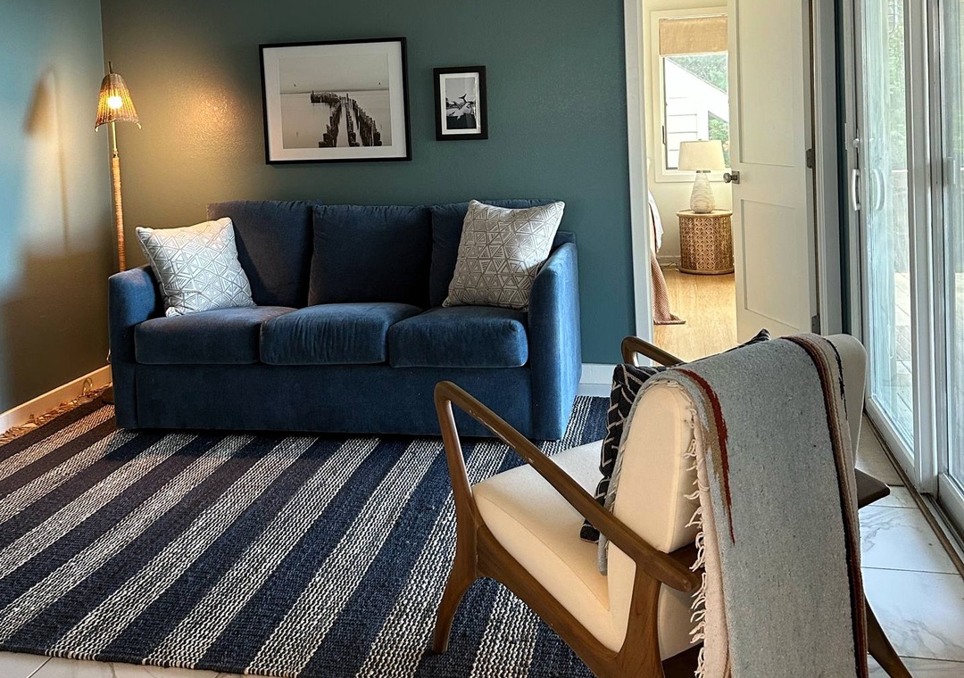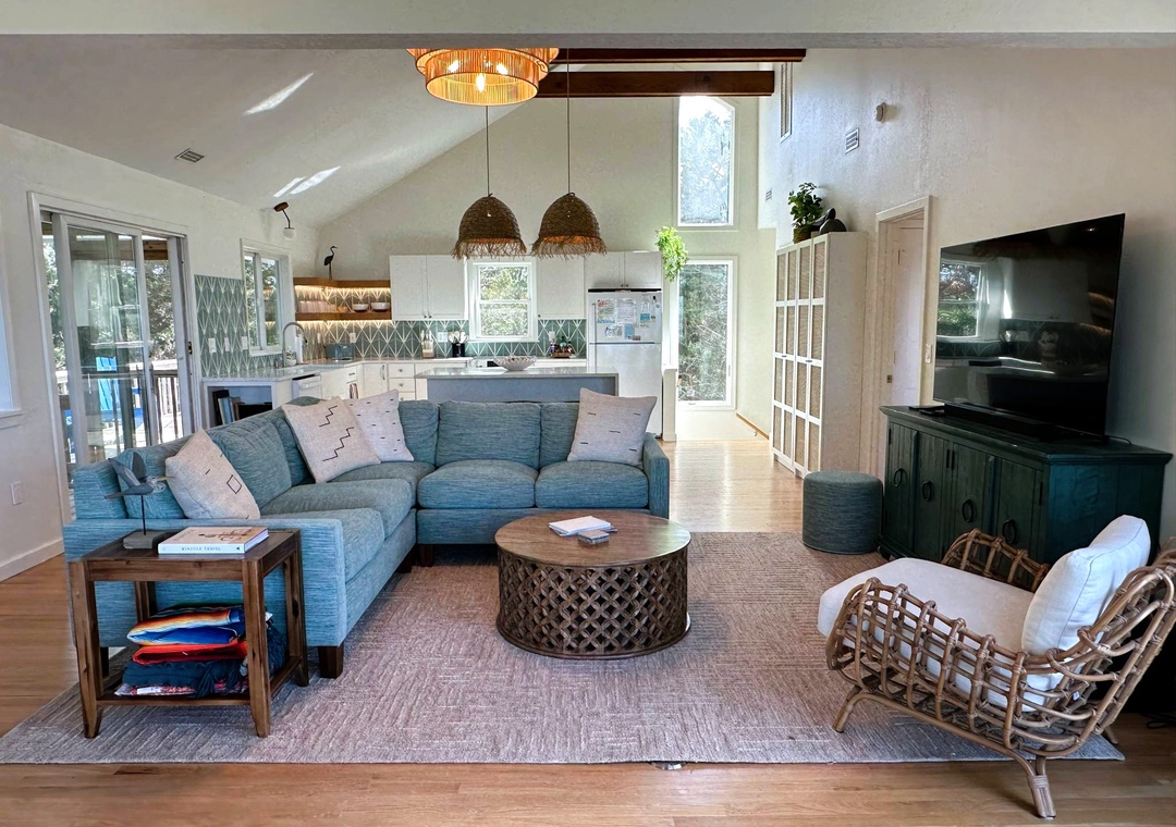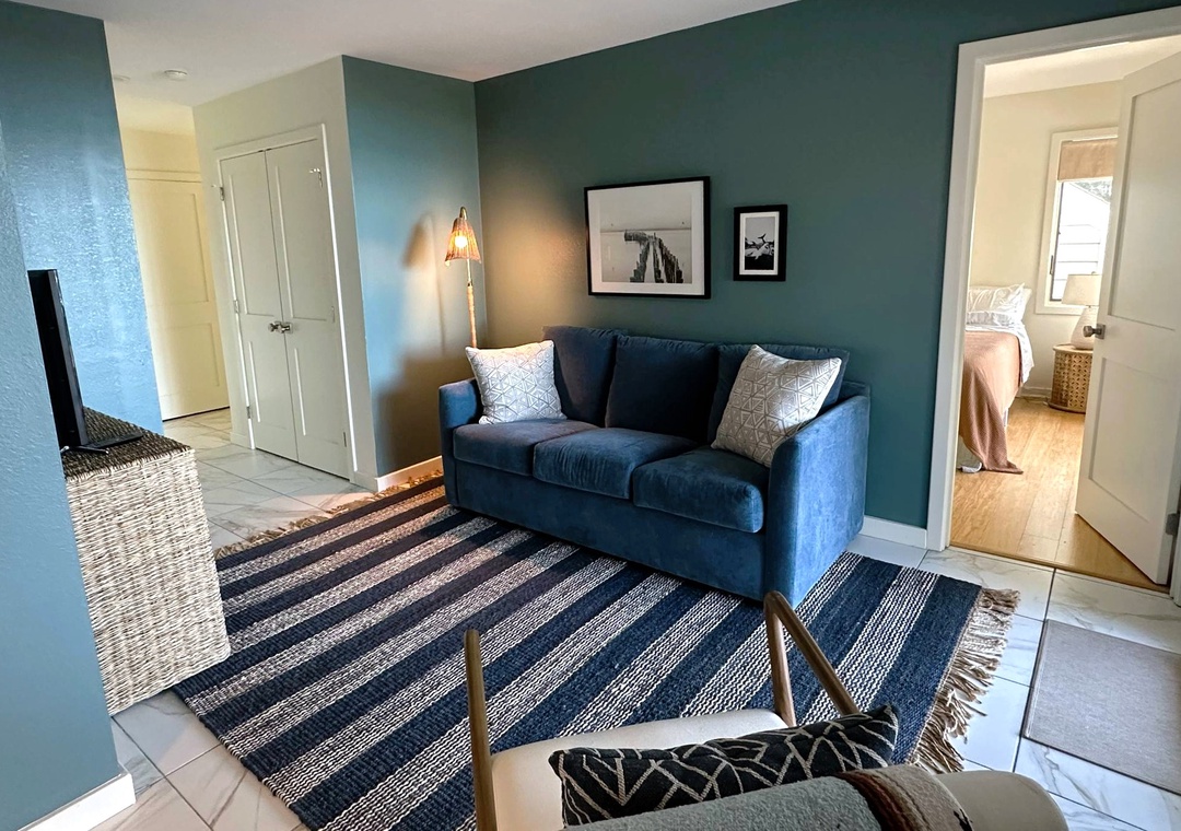 Second Floor: Open kitchen, dining and living area with TV. Bedroom with California King bed. Semi-Private Bath with whirlpool tub and separate shower.