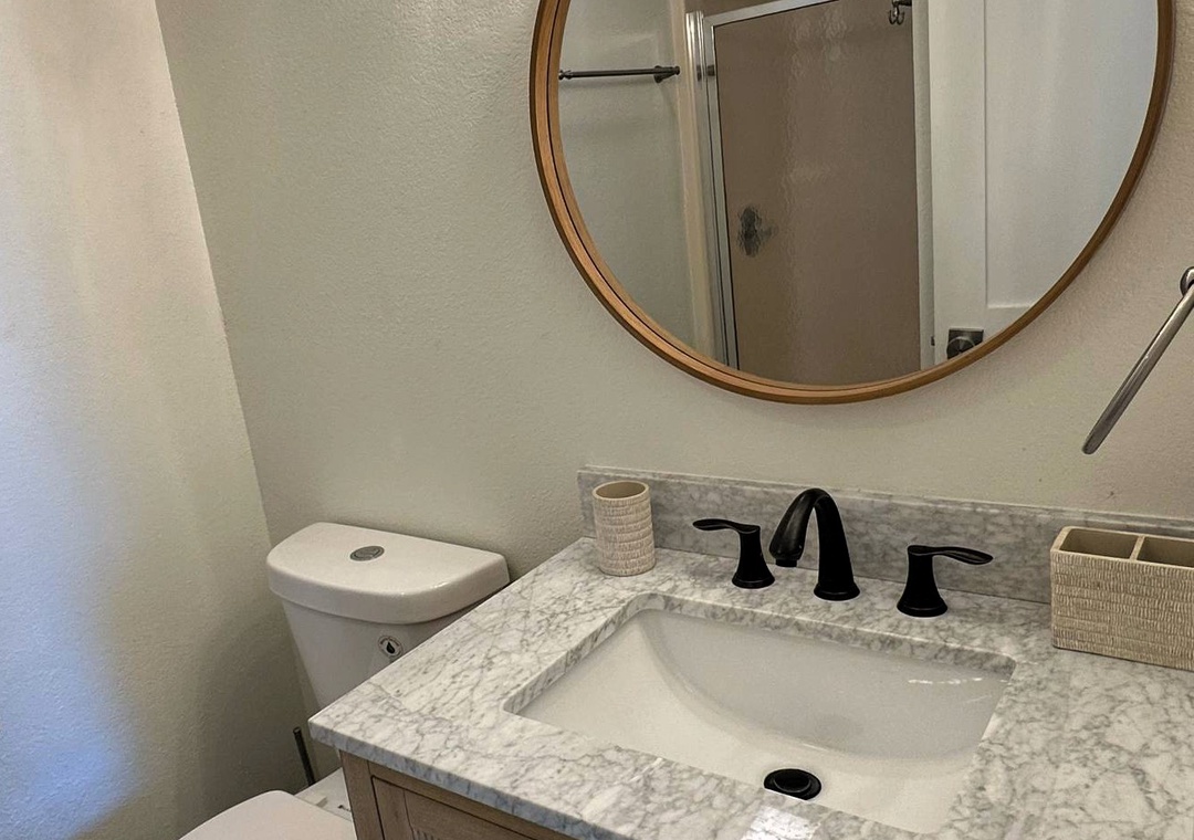 3 Bedrooms, 3 Baths: 2 with California King, 1 with two Twins. Queen Sleeper Sofa in the sitting area. 1 primary bedroom, 1 with a semi-private bathroom and 1 hallway bathroom.