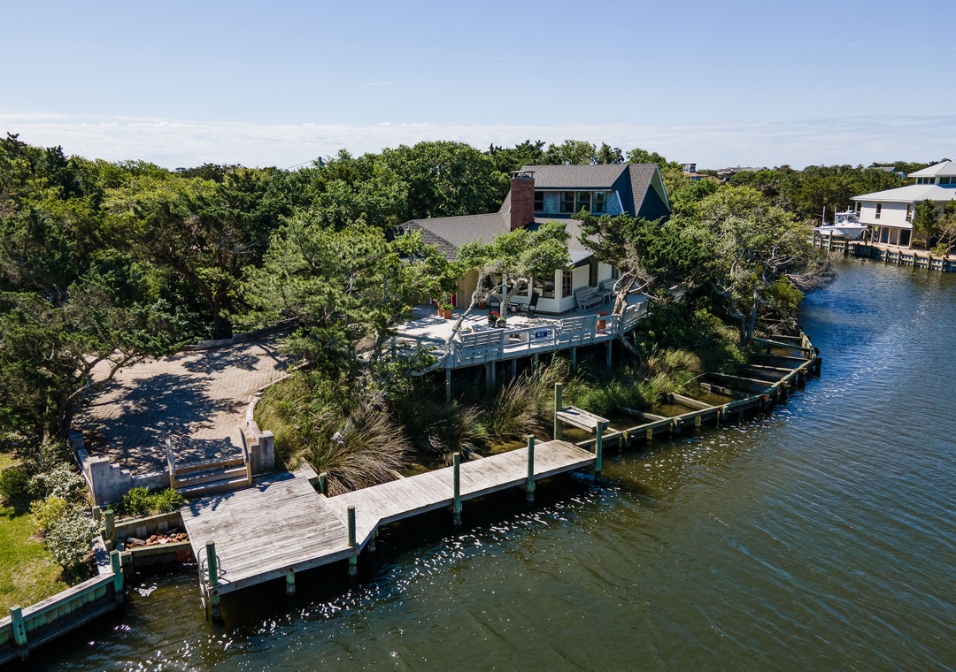 The exterior boasts a spacious canal front deck that looks out into the Pamlico Sound. Enjoy sunrise, sunset, and every minute in between relaxing in the hammock, rocking chairs, or built in benches. Outdoor shower. Enjoy meals at the picnic table built around a beautiful oak. Escape to the dock to really get away! Boat dock with fish cleaning bench.