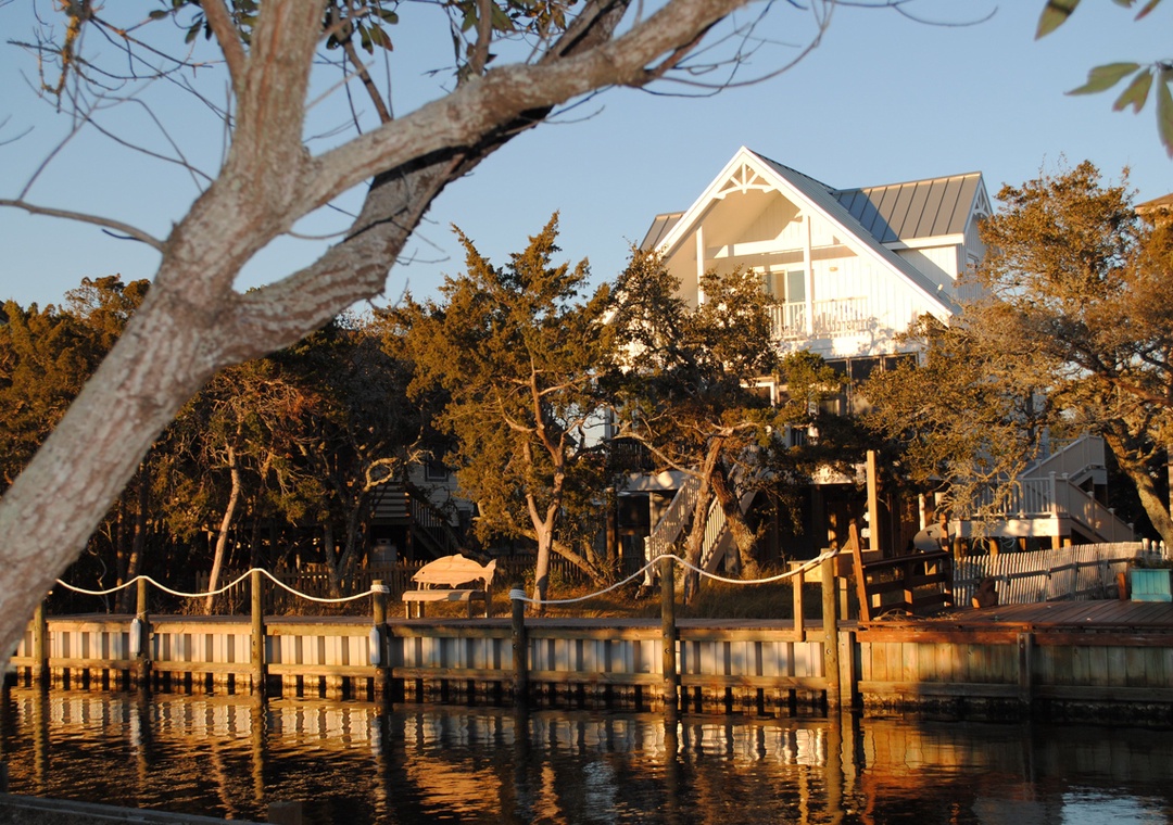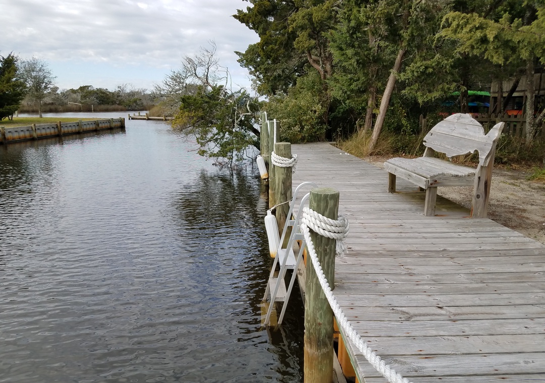 The exterior offers *private boat dockage, bulkhead with ladder offering easier water access for kayakers, covered porches, a screened porch, outdoor dining table, grill, hot/cold outdoor shower, fish cleaning bench with water and electric and storage shed. Covered parking. Two single person kayaks for exploring the nearby marshes. Life jackets are not provided, if you wish to rent them, please contact Ride The Wind Surf Shop. They will be happy to assist.