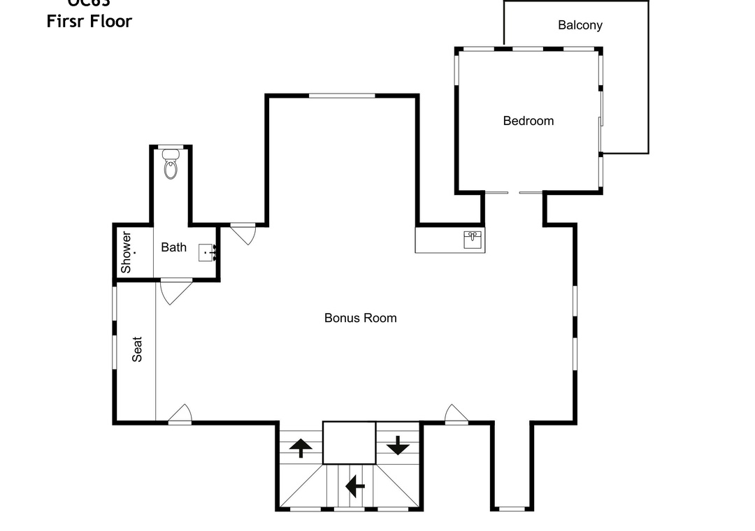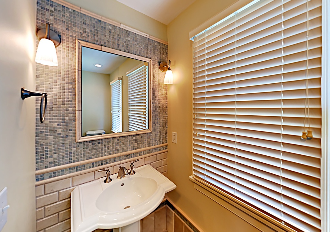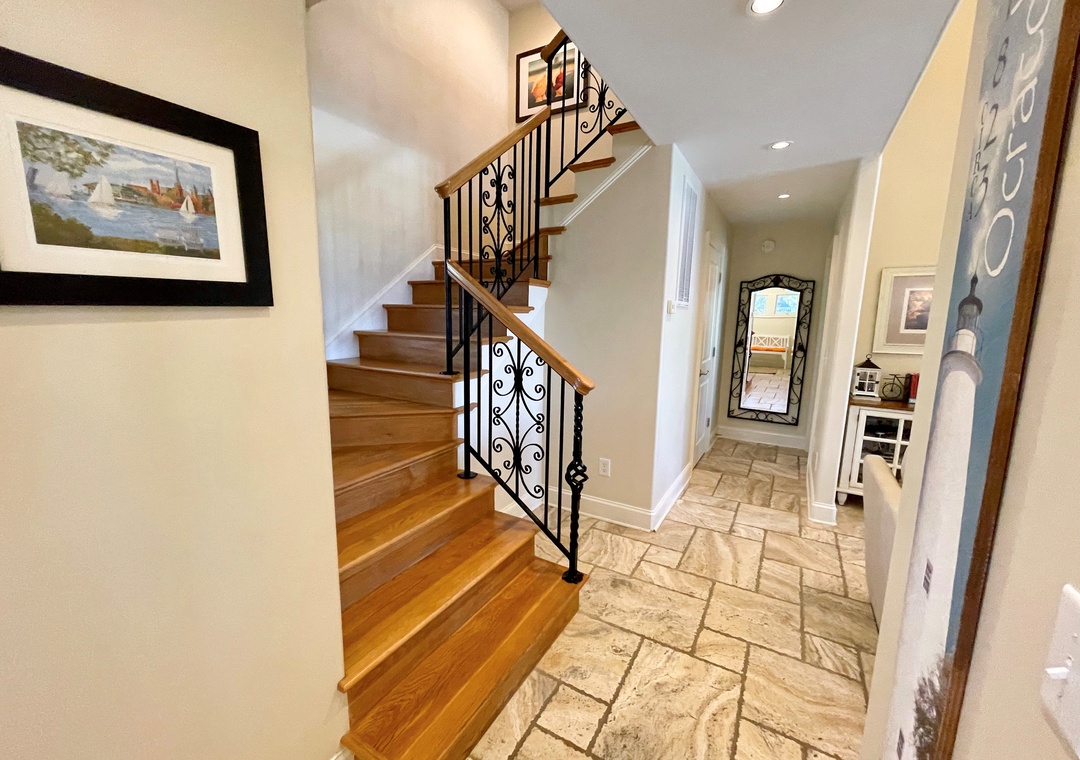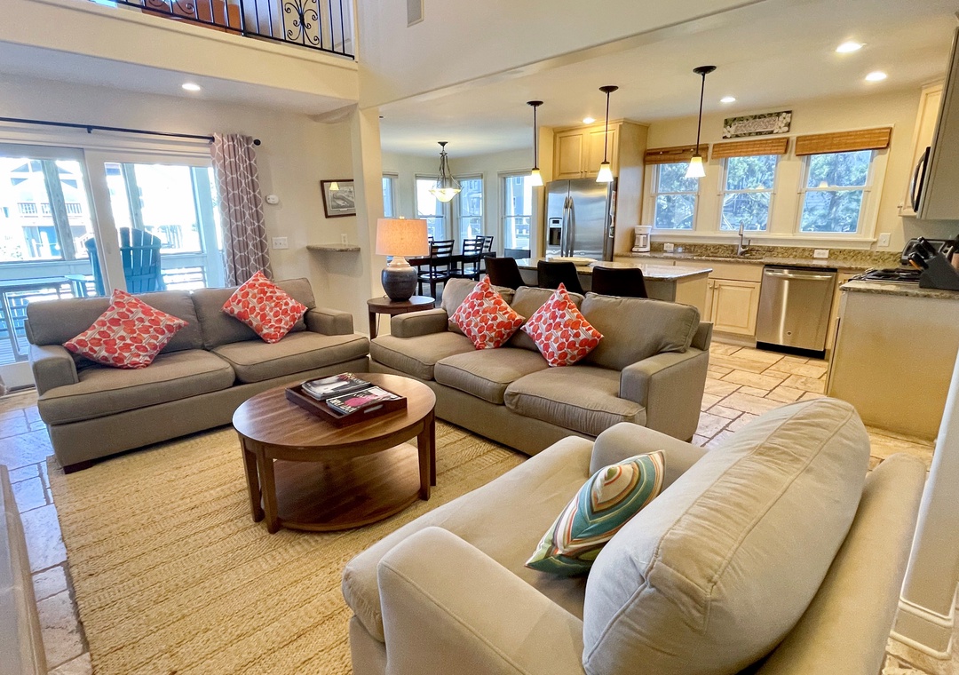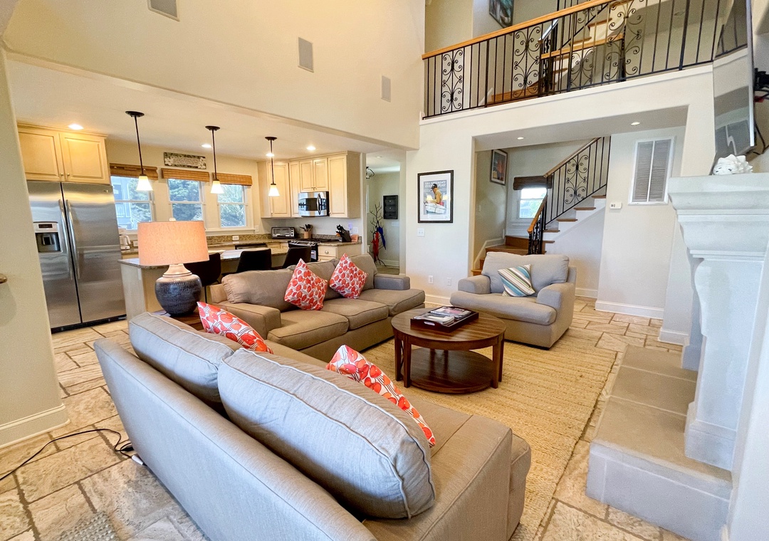 First Floor: Open kitchen, dining and living area with TV. Primary Bedroom with Queen bed and Primary Bath with soaking tub with shower. Half Bath. Laundry Closet.