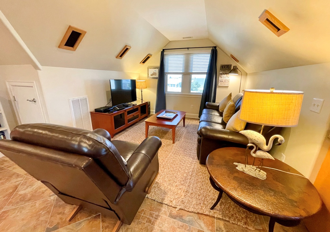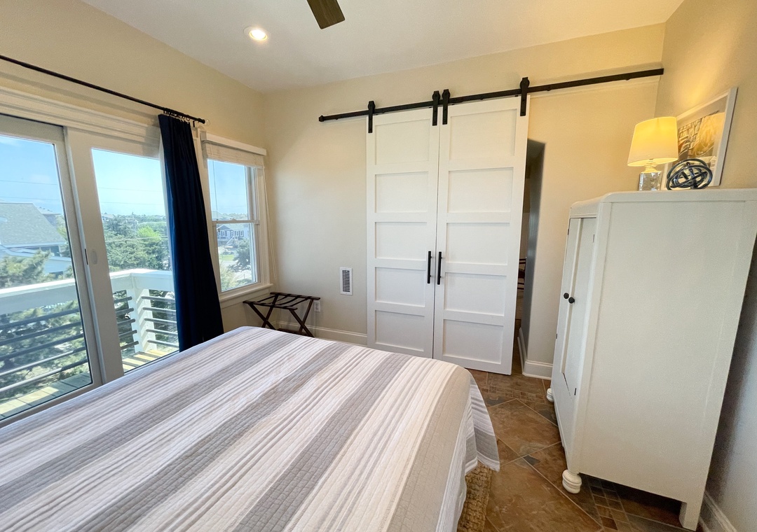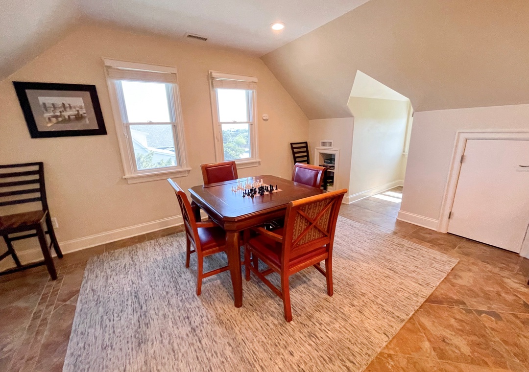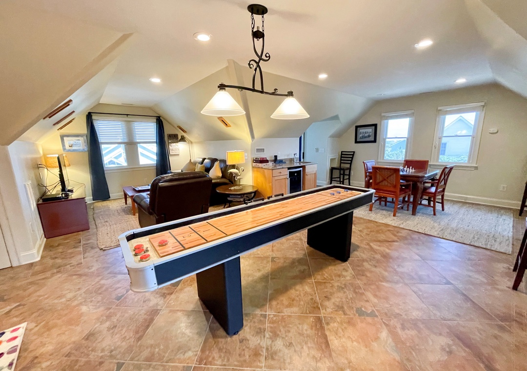 Third Floor: Bedroom with Queen located off the Den. Den offers a TV alcove, shuffleboard, wet bar and wine refrigerator. Bath with shower.