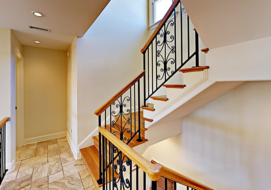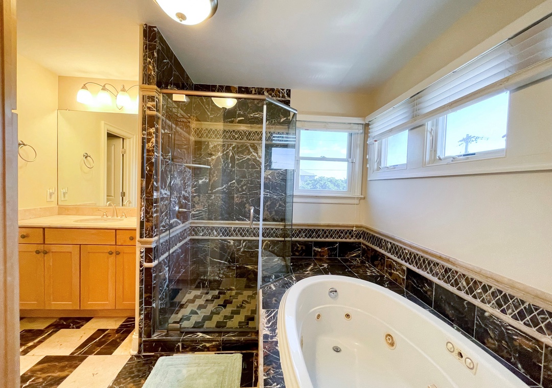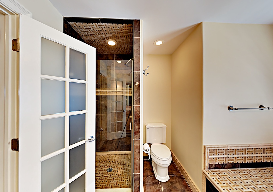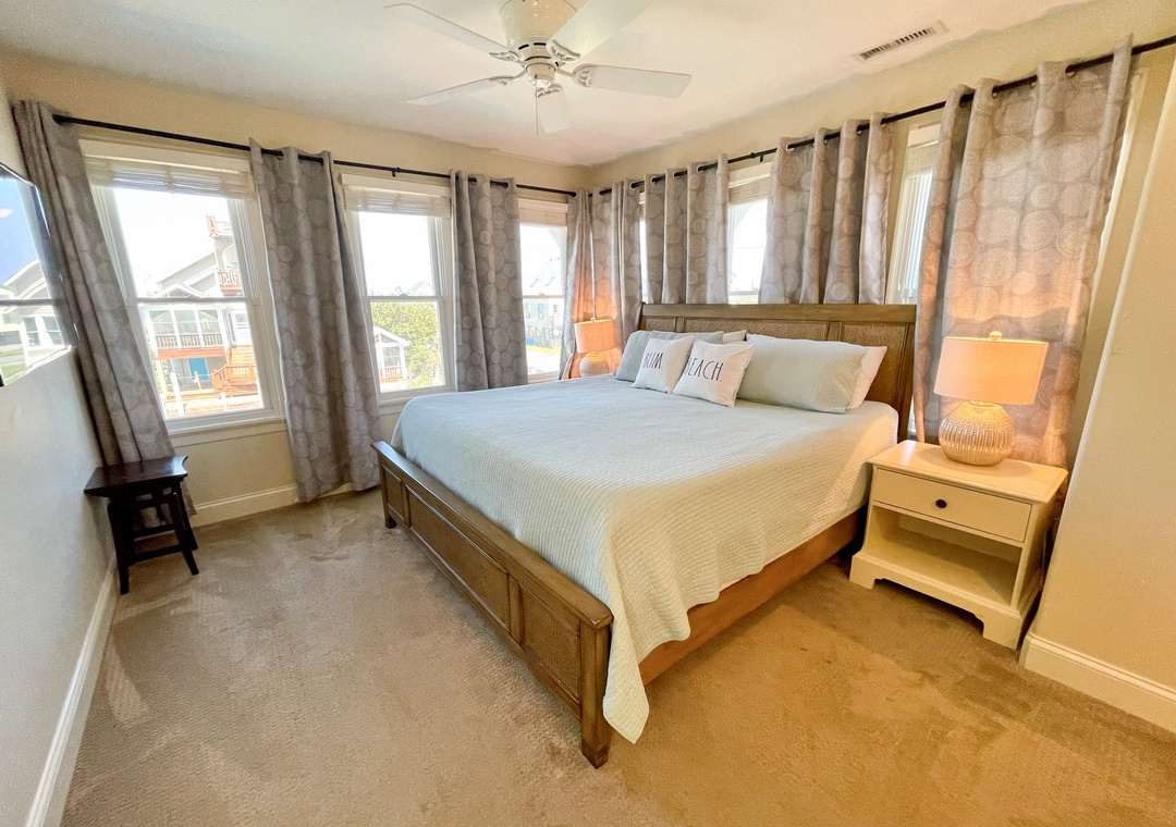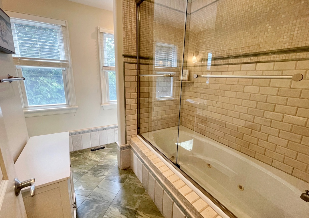 Second Floor: Primary Bedroom with King bed, TV, and Primary Bath with soaking tub and separate shower. Primary Bedroom with King bed and Primary Bath with soaking tub with shower.